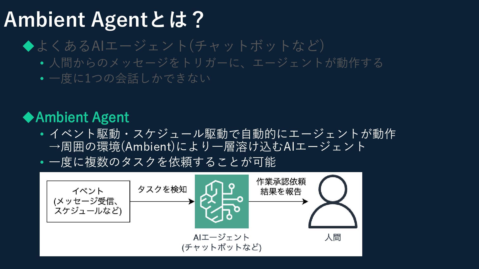 Ambient Agentとは? ◆よくあるAIエージェント(チャットボットなど) • 人間からのメッセージをトリガーに、エージェントが動作する • 一度に1つの会話しかできない ◆Ambient Agent •