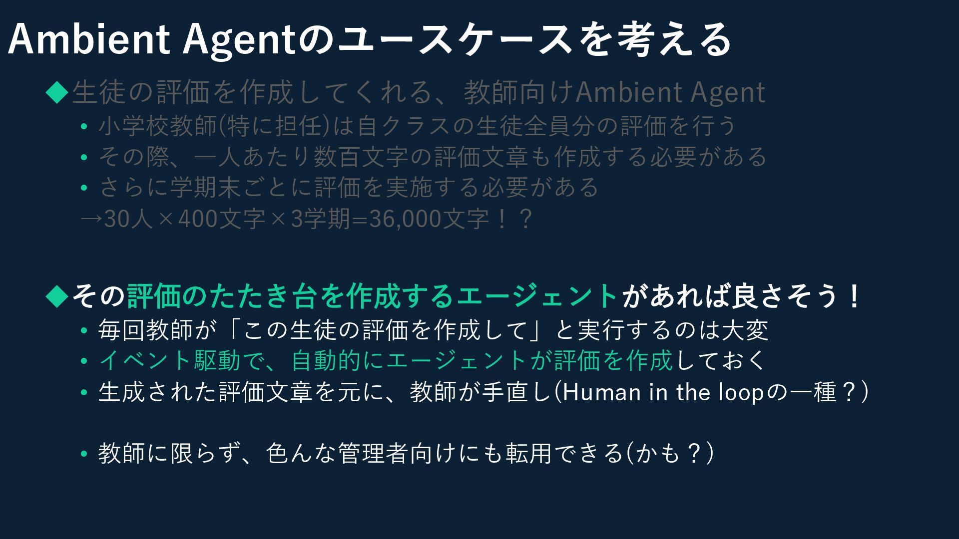 Ambient Agentのユースケースを考える ◆生徒の評価を作成してくれる、教師向けAmbient Agent • 小学校教師(特に担任)は自クラスの生徒全員分の評価を行う • その際、一人あたり数百文字の評価文章も作成する必要がある • さらに学期末ごとに評価を実施する必要がある