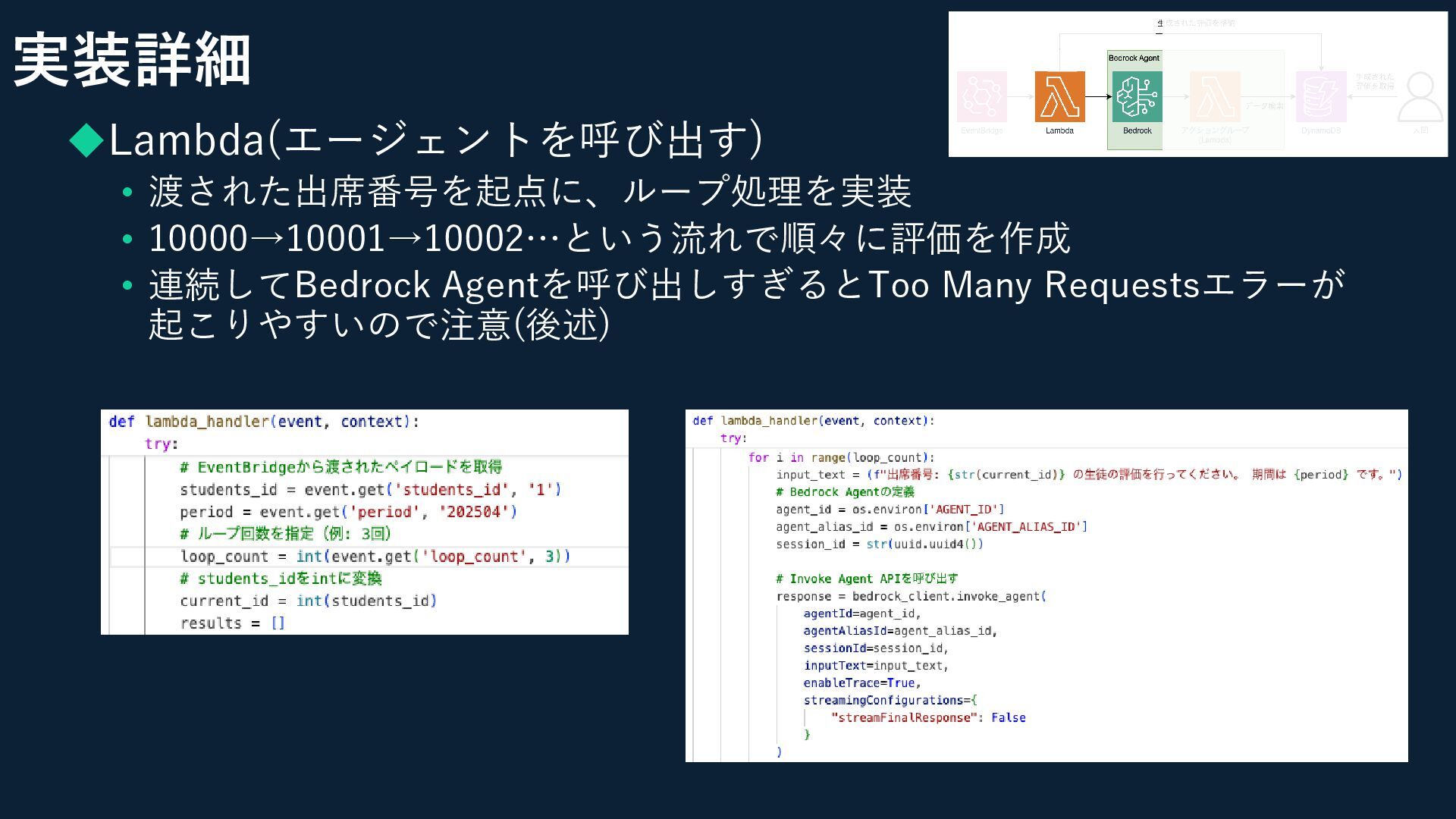 実装詳細 ◆Lambda(エージェントを呼び出す) • 渡された出席番号を起点に、ループ処理を実装 • 10000→10001→10002…という流れで順々に評価を作成 • 連続してBedrock Agentを呼び出しすぎるとToo Many