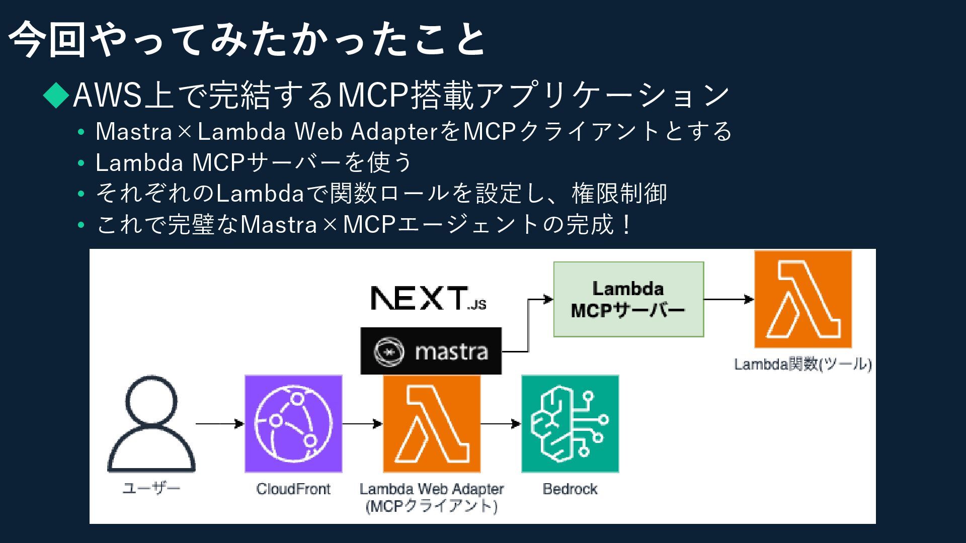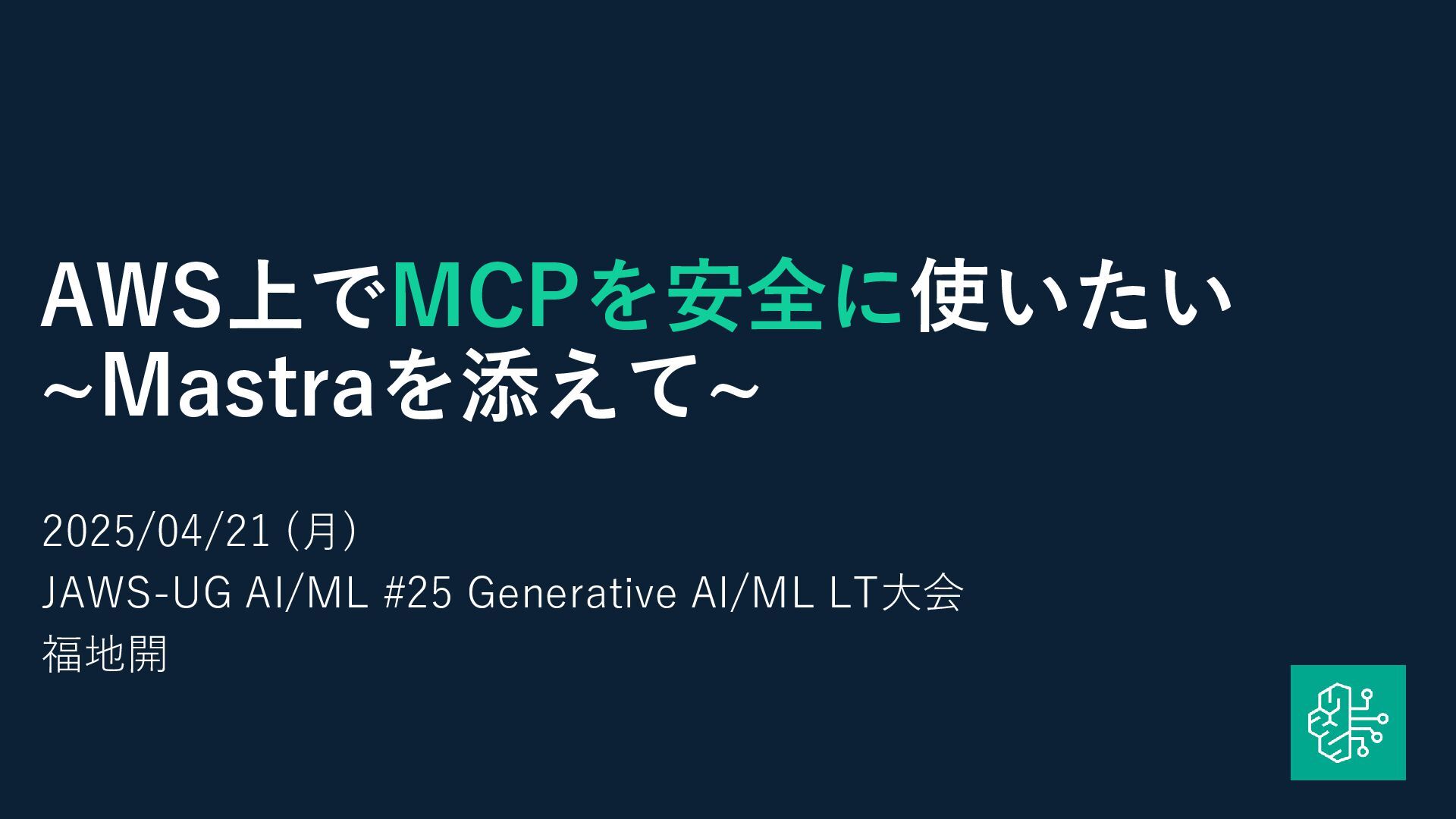 AWS上でMCPを安全に使いたい ~Mastraを添えて~ 2025/04/21 (月) JAWS-UG AI/ML #25 Generative AI/ML LT大会