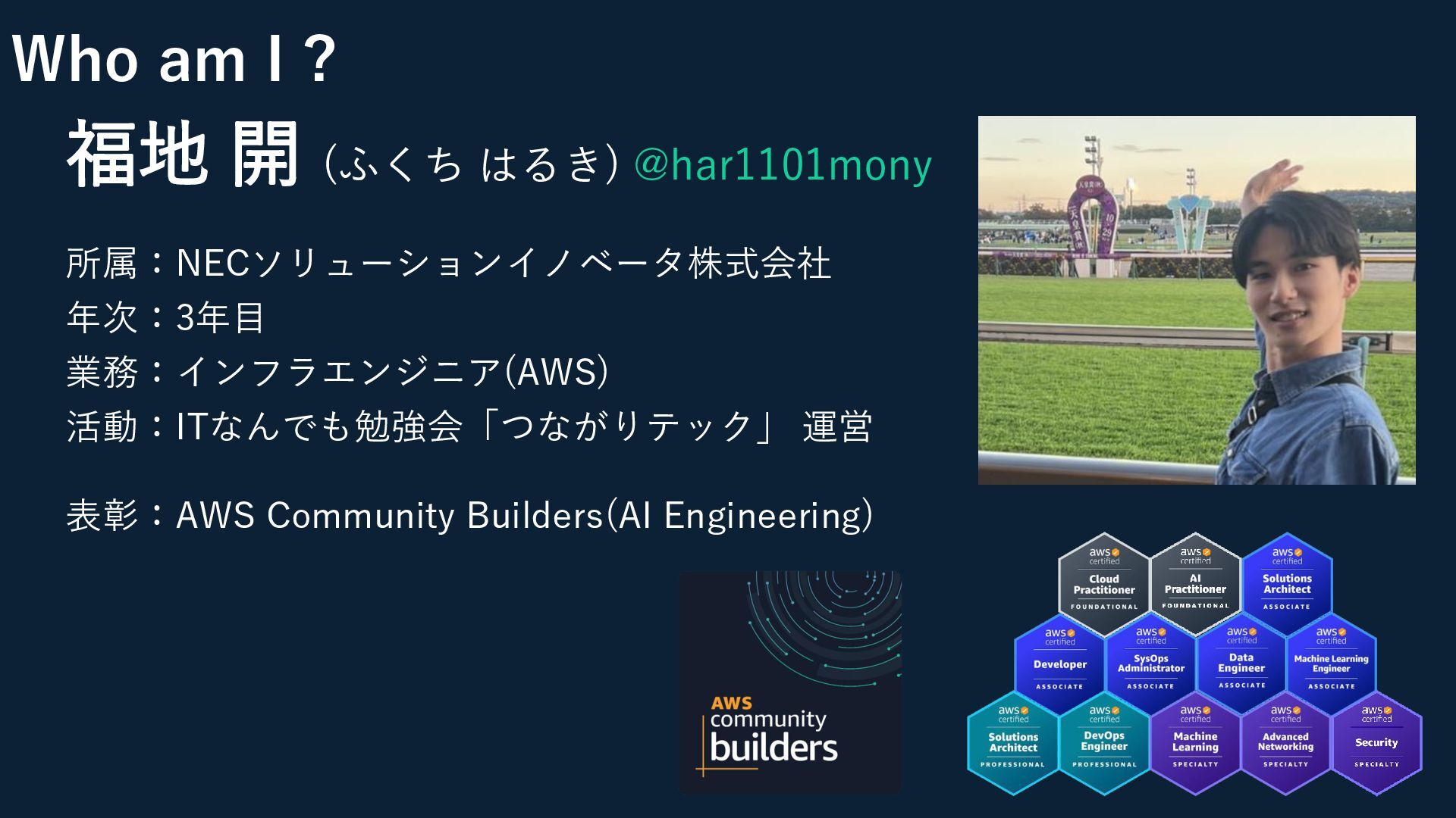 年次:3年目 業務:インフラエンジニア(AWS) 活動:ITなんでも勉強会「つながりテック」 運営 表彰:AWS Community Builders(AI Engineering)