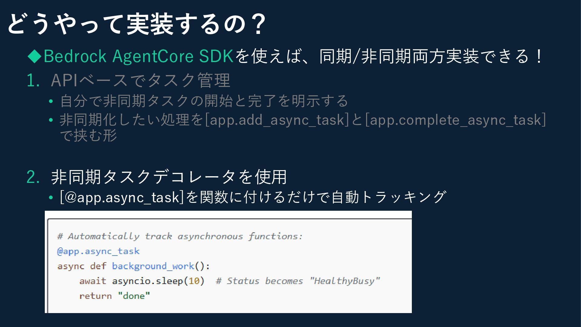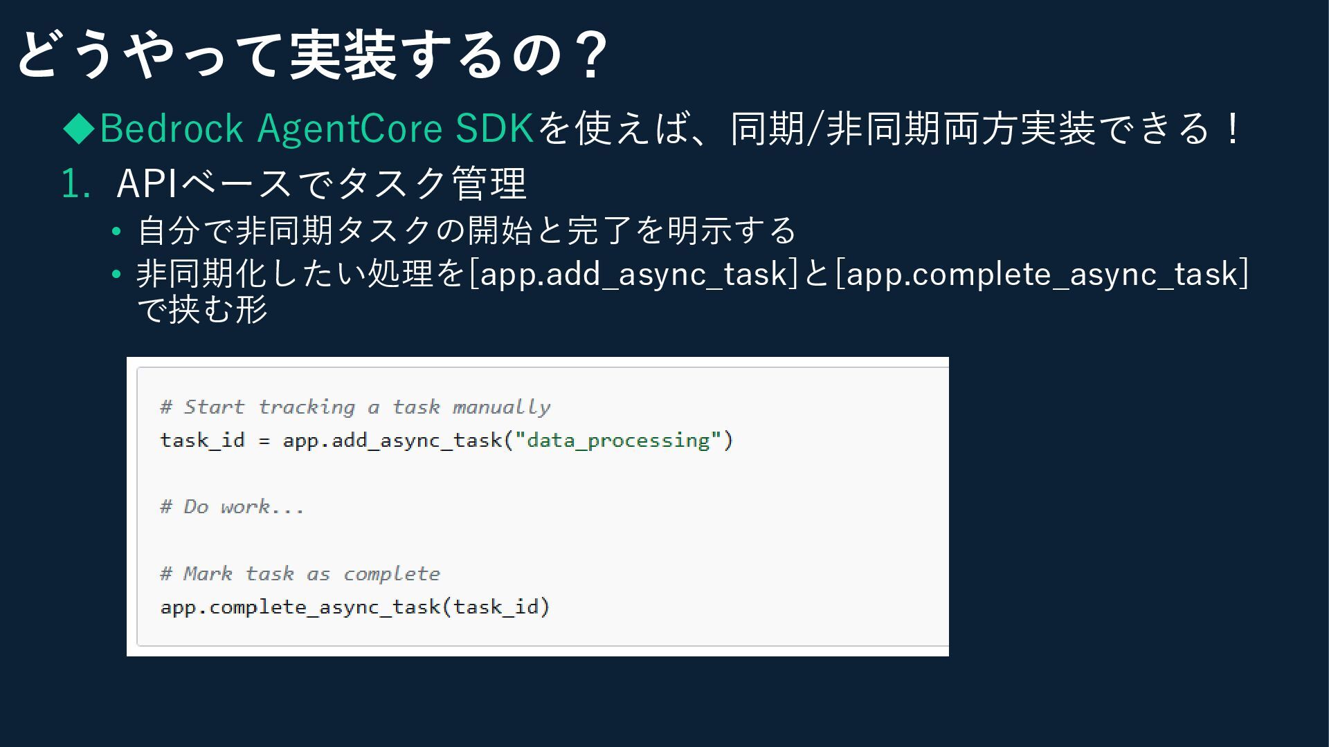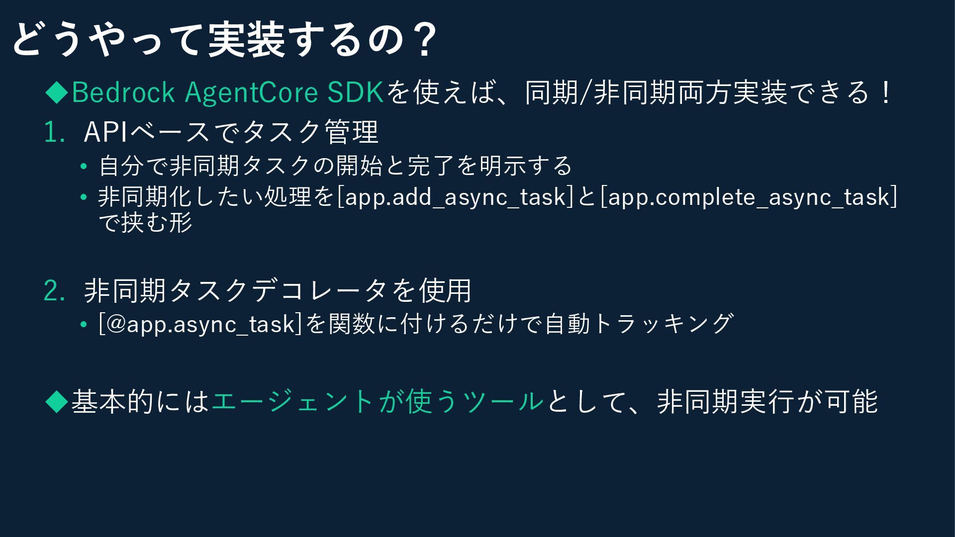 ◆Bedrock AgentCore SDKを使えば、同期/非同期両方実装できる! 1. APIベースでタスク管理 • 自分で非同期タスクの開始と完了を明示する • 非同期化したい処理を[app.add_async_task]と[app.complete_async_task] で挟む形