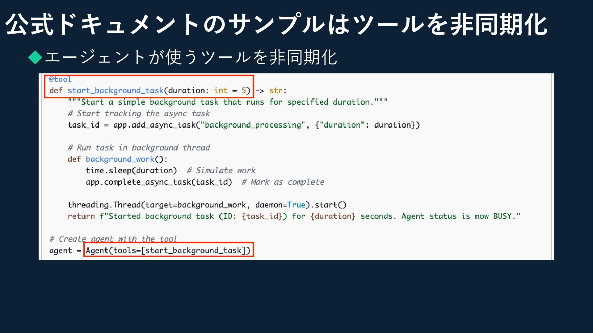 2. 非同期タスクデコレータを使用 • [@app.async_task]を関数に付けるだけで自動トラッキング ◆基本的にはエージェントが使うツールとして、非同期実行が可能 どうやって実装するの?