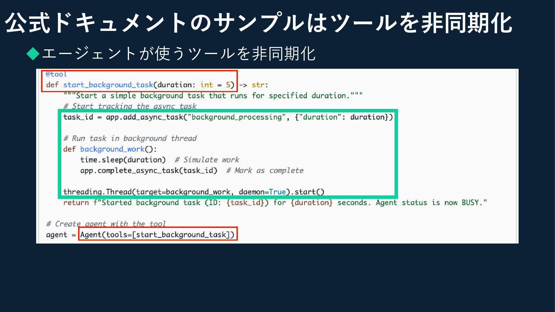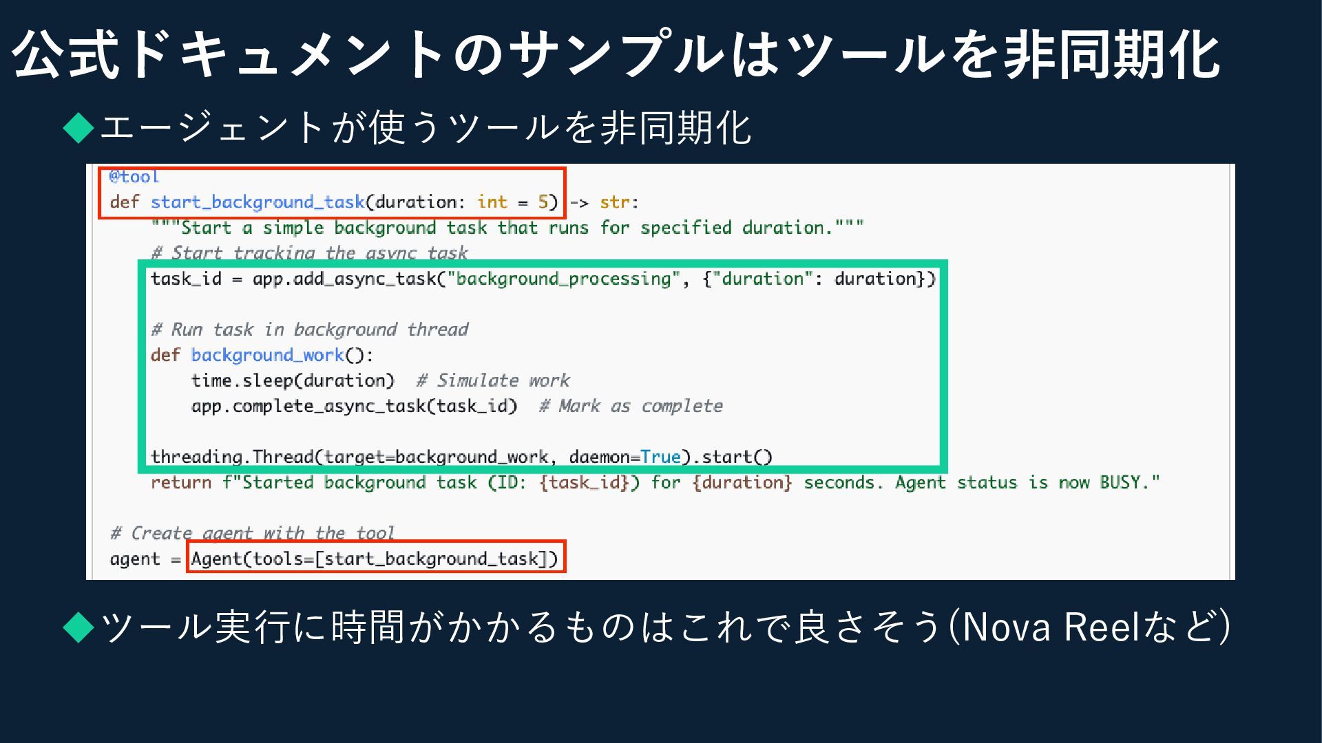◆エージェントが使うツールを非同期化 ◆ツール実行に時間がかかるものはこれで良さそう(Nova Reelなど) 公式ドキュメントのサンプルはツールを非同期化