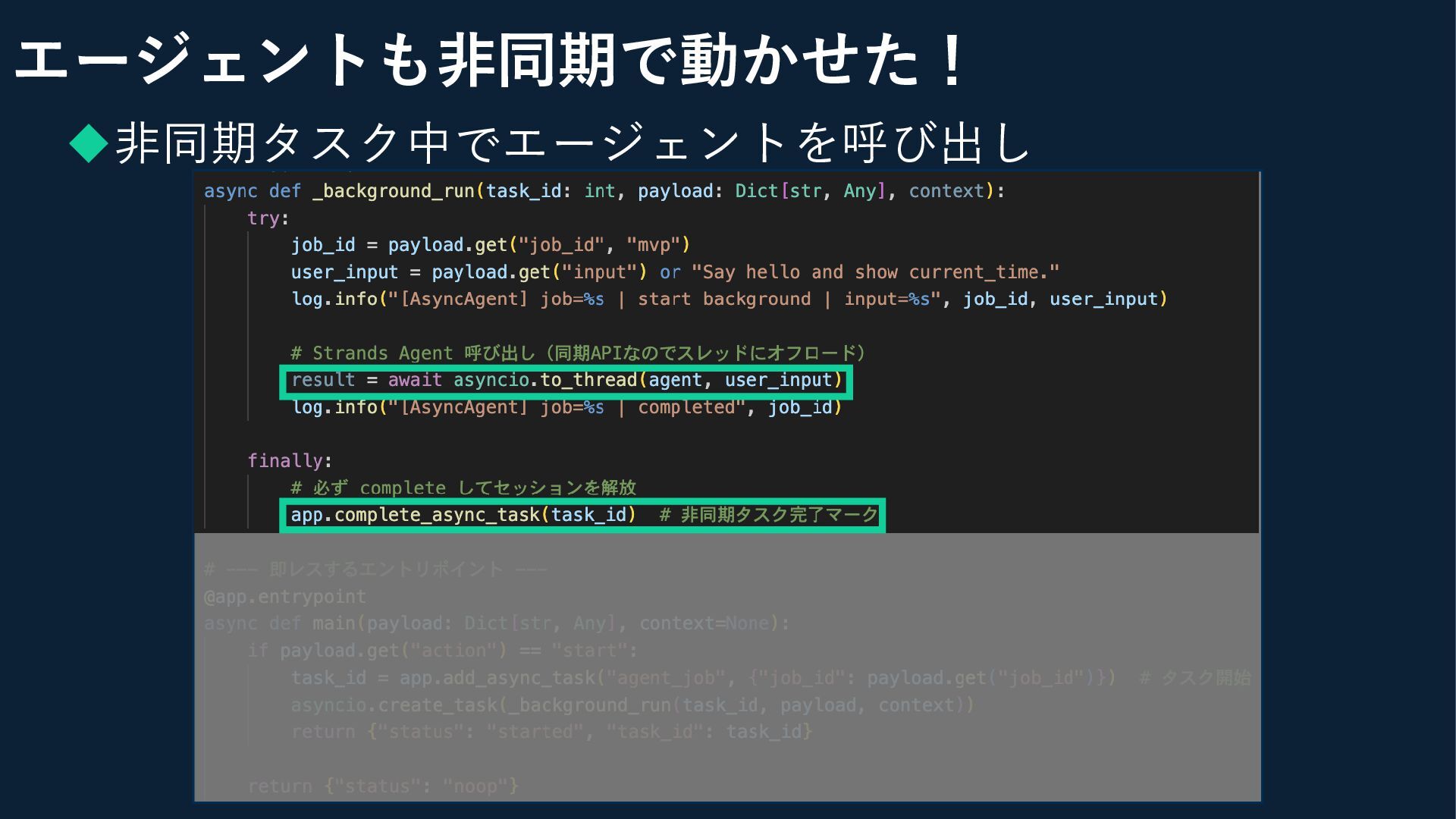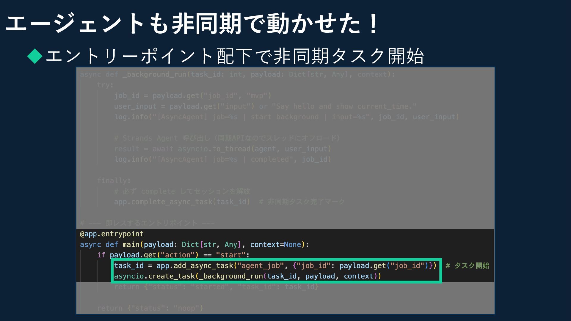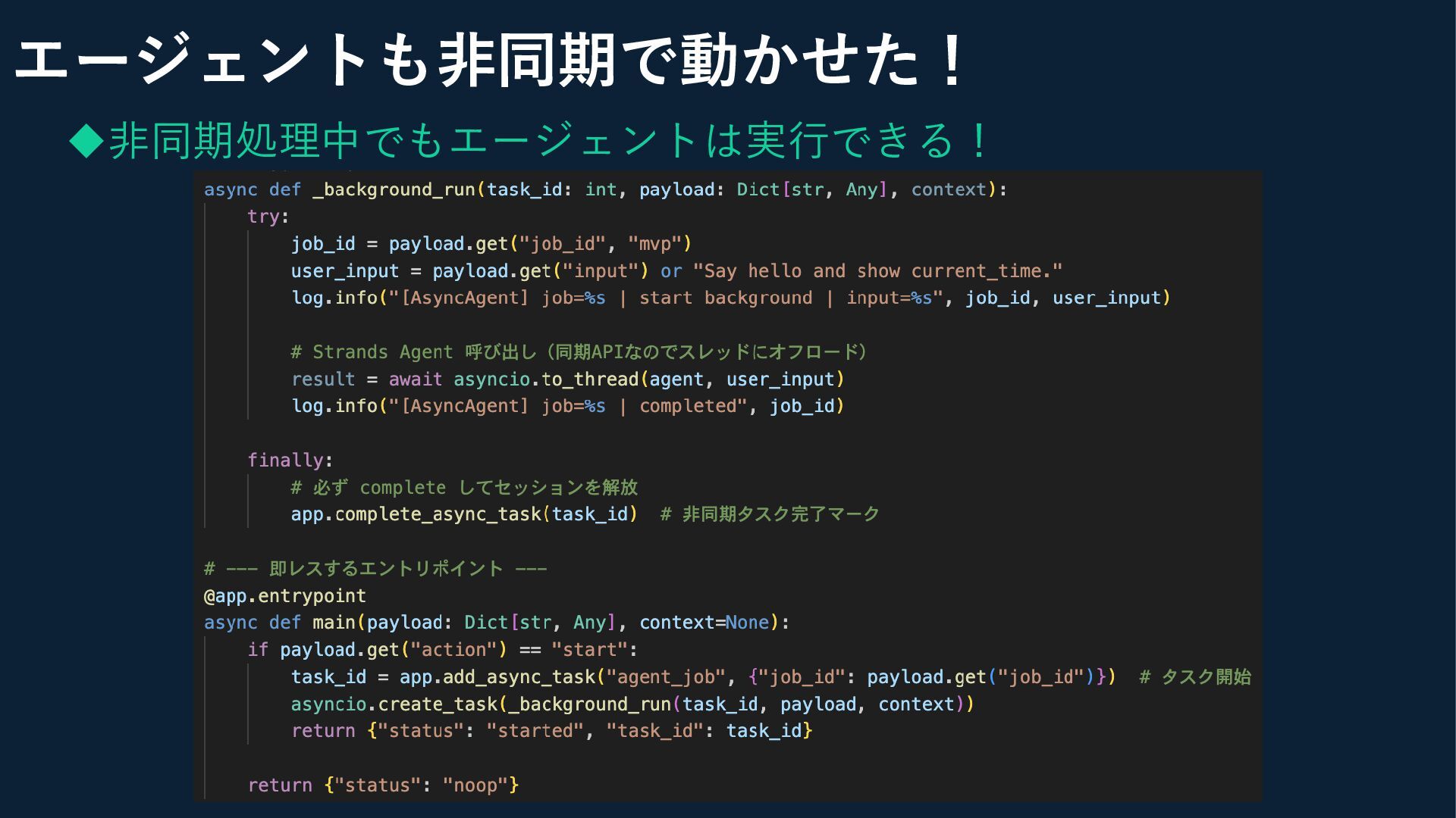 ◆エントリーポイント配下で非同期タスク開始 エージェントも非同期で動かせた!