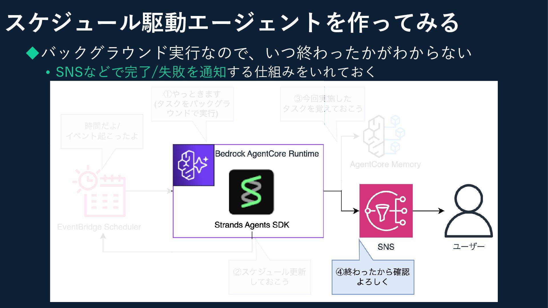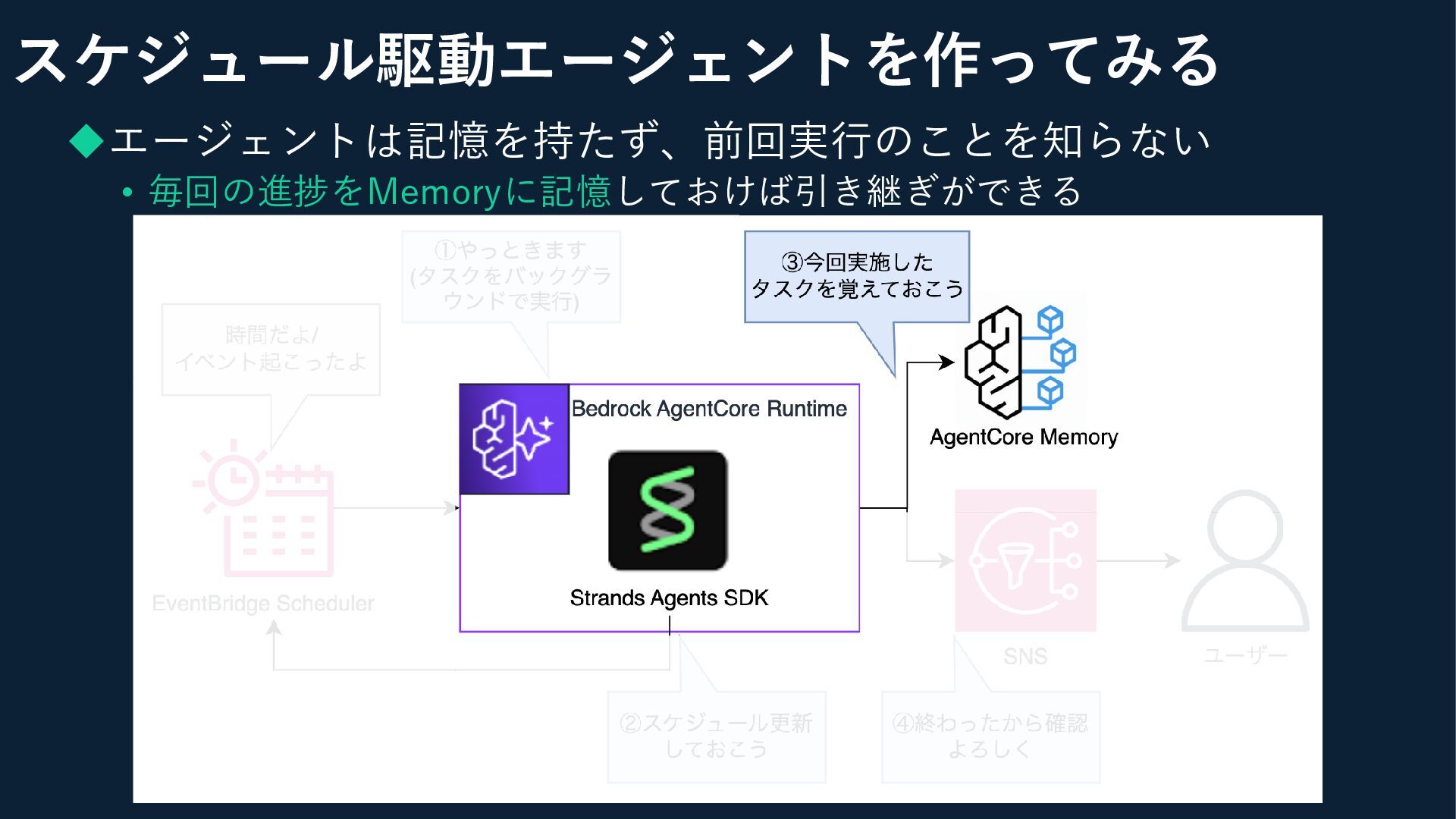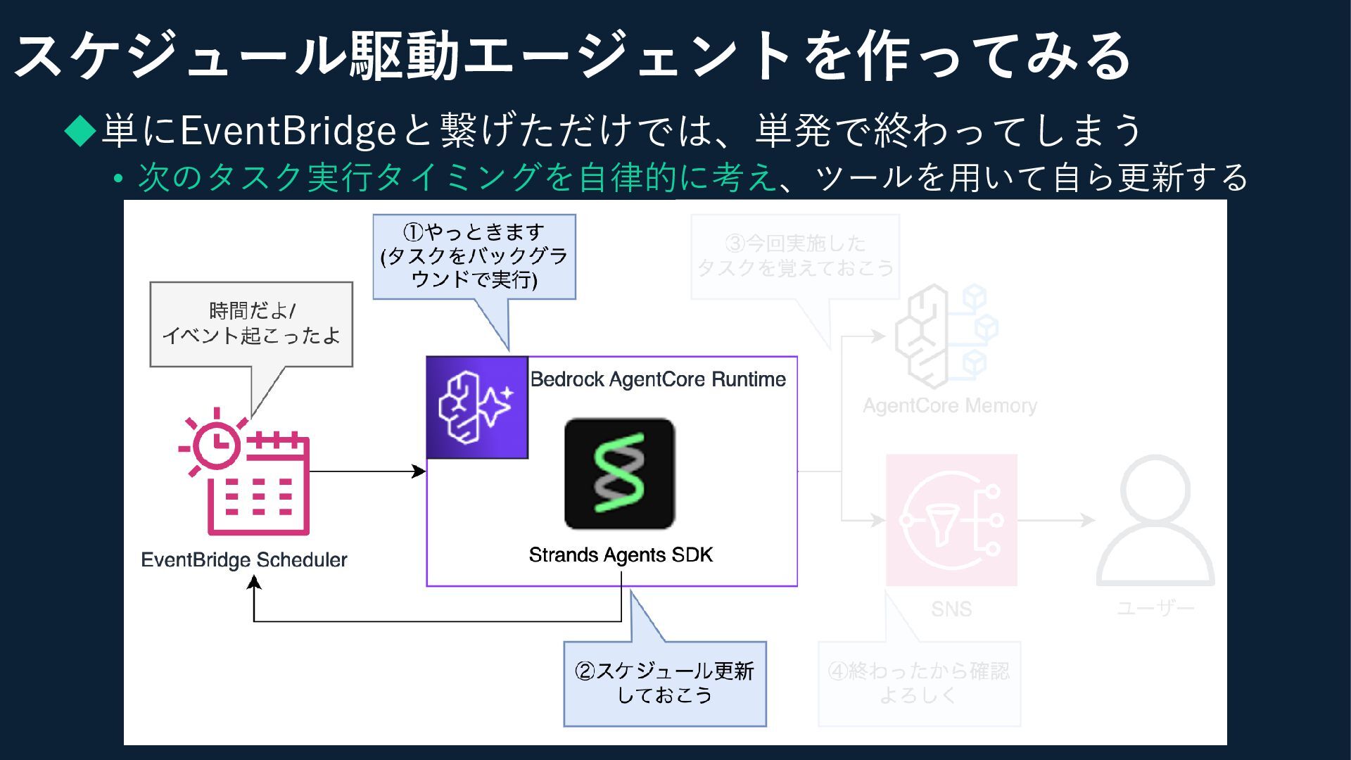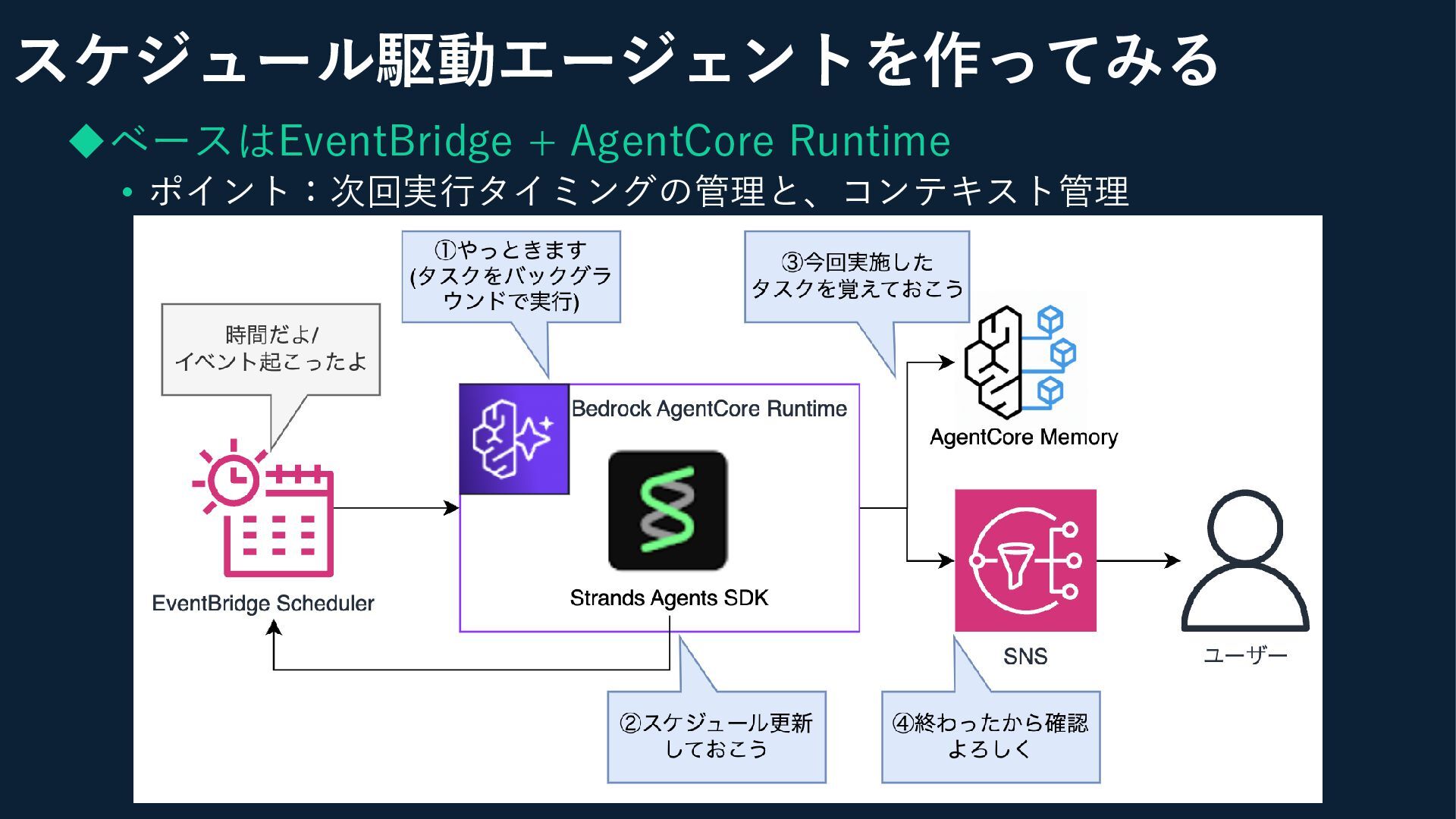 ◆ベースはEventBridge + AgentCore Runtime • ポイント:次回実行タイミングの管理と、コンテキスト管理 スケジュール駆動エージェントを作ってみる