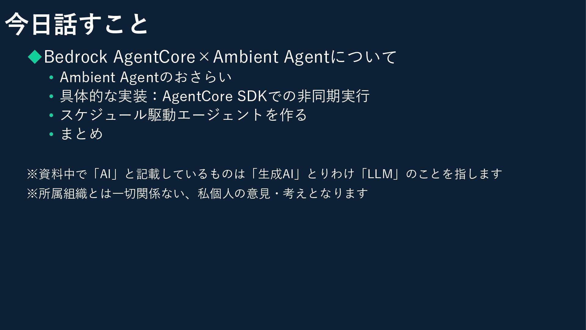 • スケジュール駆動エージェントを作る • まとめ ※資料中で「AI」と記載しているものは「生成AI」とりわけ「LLM」のことを指します ※所属組織とは一切関係ない、私個人の意見・考えとなります