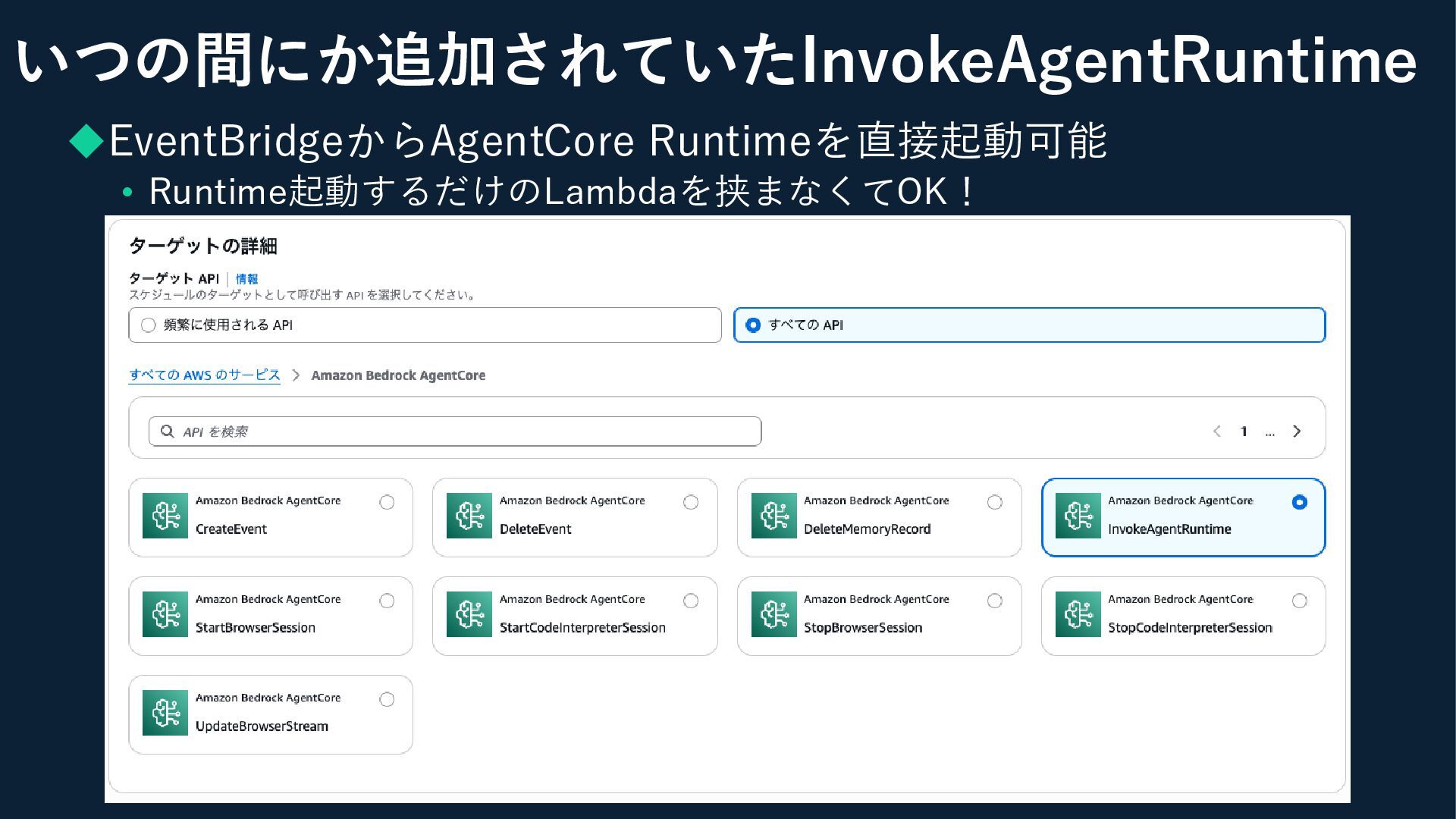 ◆EventBridgeからAgentCore Runtimeを直接起動可能 • Runtime起動するだけのLambdaを挟まなくてOK! いつの間にか追加されていたInvokeAgentRuntime