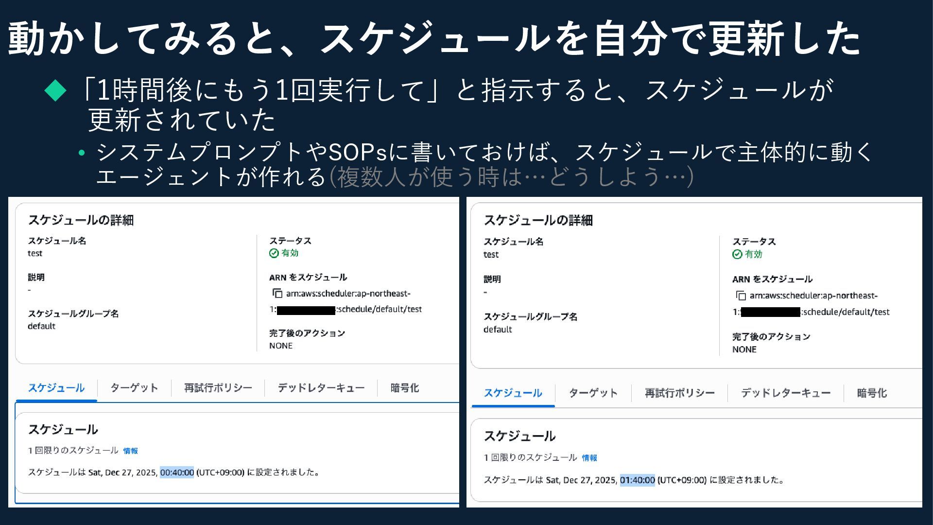 ◆「1時間後にもう1回実行して」と指示すると、スケジュールが 更新されていた • システムプロンプトやSOPsに書いておけば、スケジュールで主体的に動く エージェントが作れる(複数人が使う時は…どうしよう…) 動かしてみると、スケジュールを自分で更新した