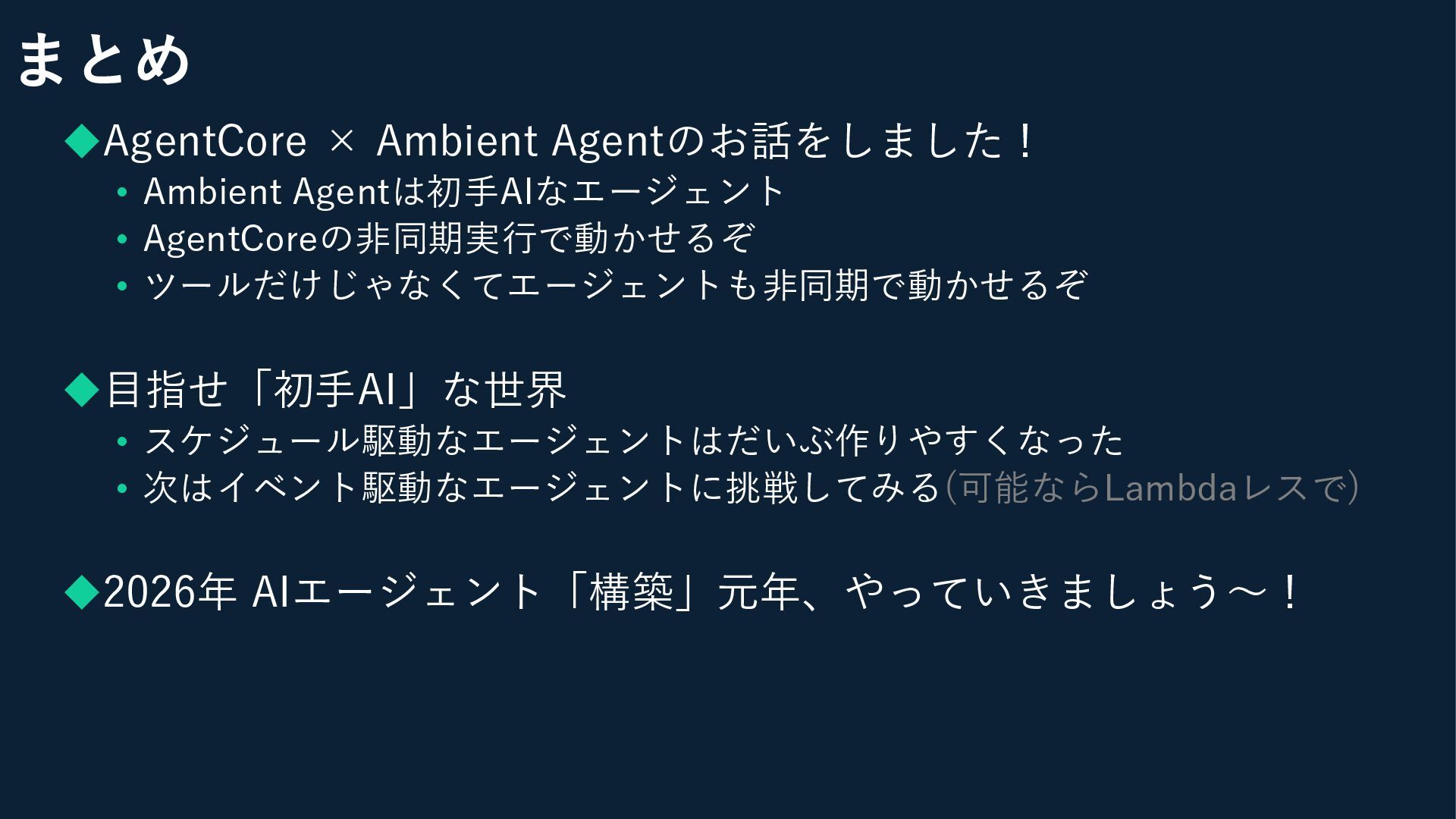 ツールだけじゃなくてエージェントも非同期で動かせるぞ ◆目指せ「初手AI」な世界 • スケジュール駆動なエージェントはだいぶ作りやすくなった • 次はイベント駆動なエージェントに挑戦してみる(可能ならLambdaレスで) ◆2026年 AIエージェント「構築」元年、やっていきましょう〜! まとめ