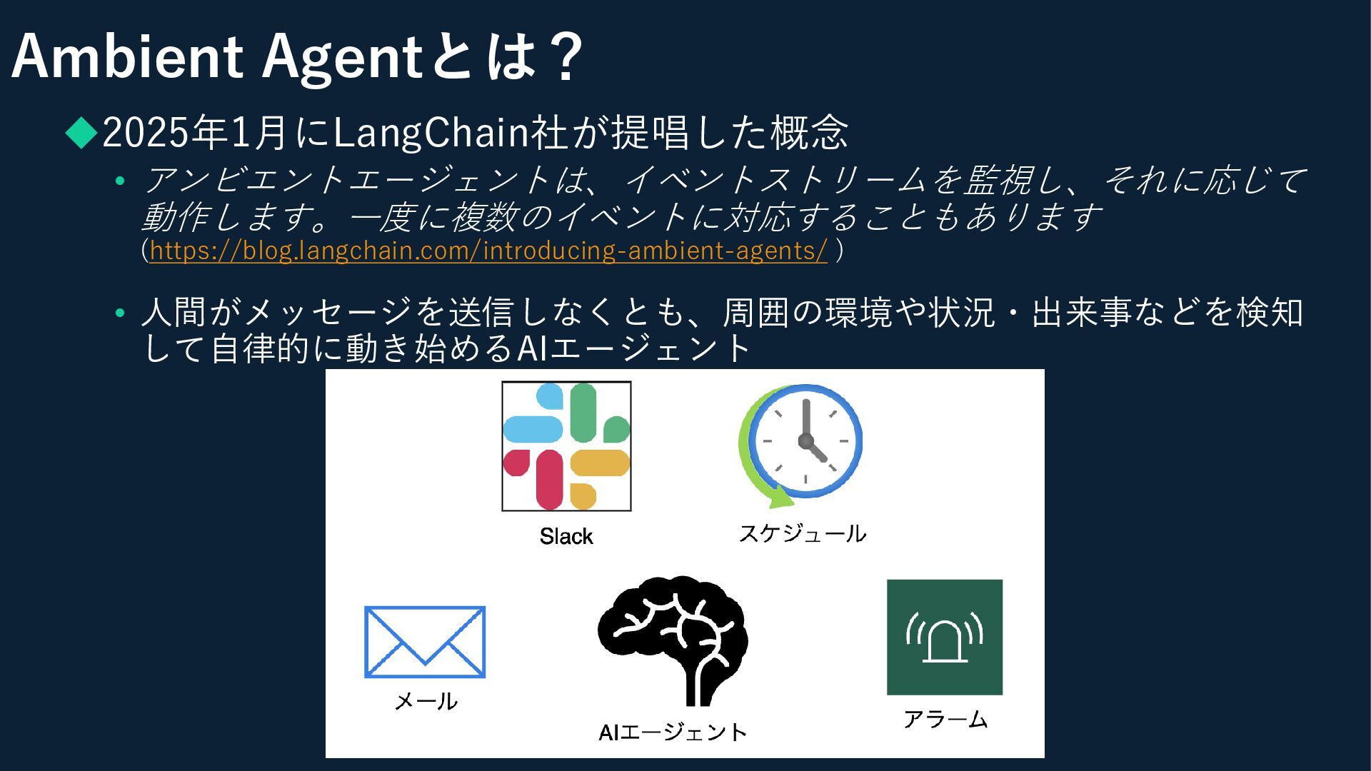 ◆2025年1月にLangChain社が提唱した概念 • アンビエントエージェントは、イベントストリームを監視し、それに応じて 動作します。一度に複数のイベントに対応することもあります (https://blog.langchain.com/introducing-ambient-agents/ ) • 人間がメッセージを送信しなくとも、周囲の環境や状況・出来事などを検知 して自律的に動き始めるAIエージェント Ambient