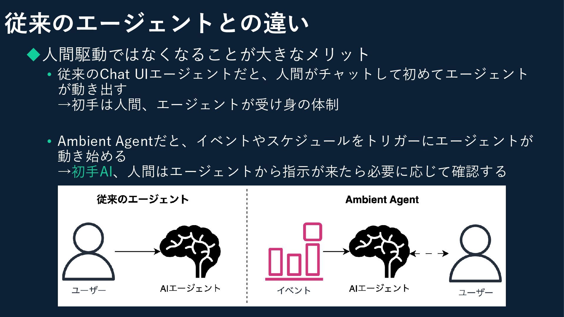 ◆人間駆動ではなくなることが大きなメリット • 従来のChat UIエージェントだと、人間がチャットして初めてエージェント が動き出す →初手は人間、エージェントが受け身の体制 • Ambient Agentだと、イベントやスケジュールをトリガーにエージェントが 動き始める