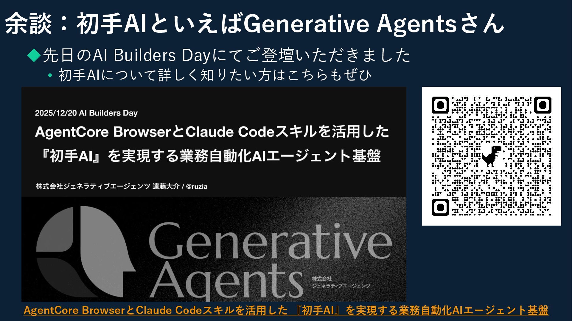 ◆先日のAI Builders Dayにてご登壇いただきました • 初手AIについて詳しく知りたい方はこちらもぜひ 余談:初手AIといえばGenerative Agentsさん AgentCore Browser と