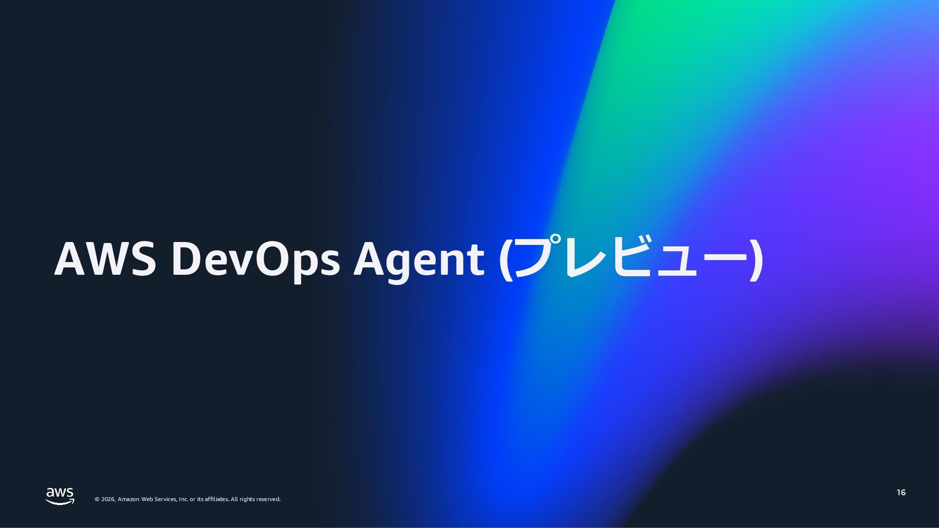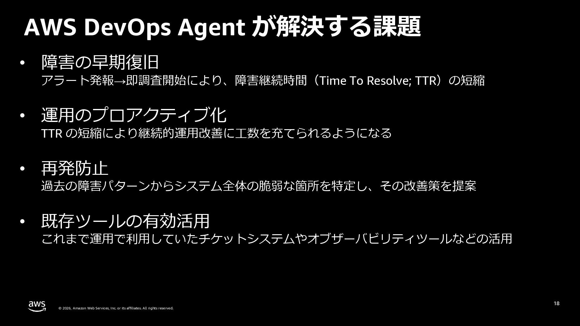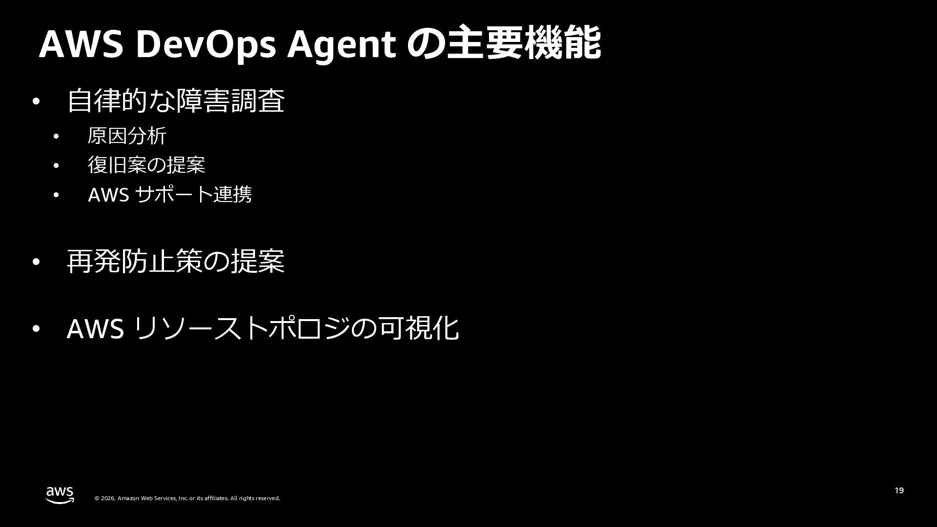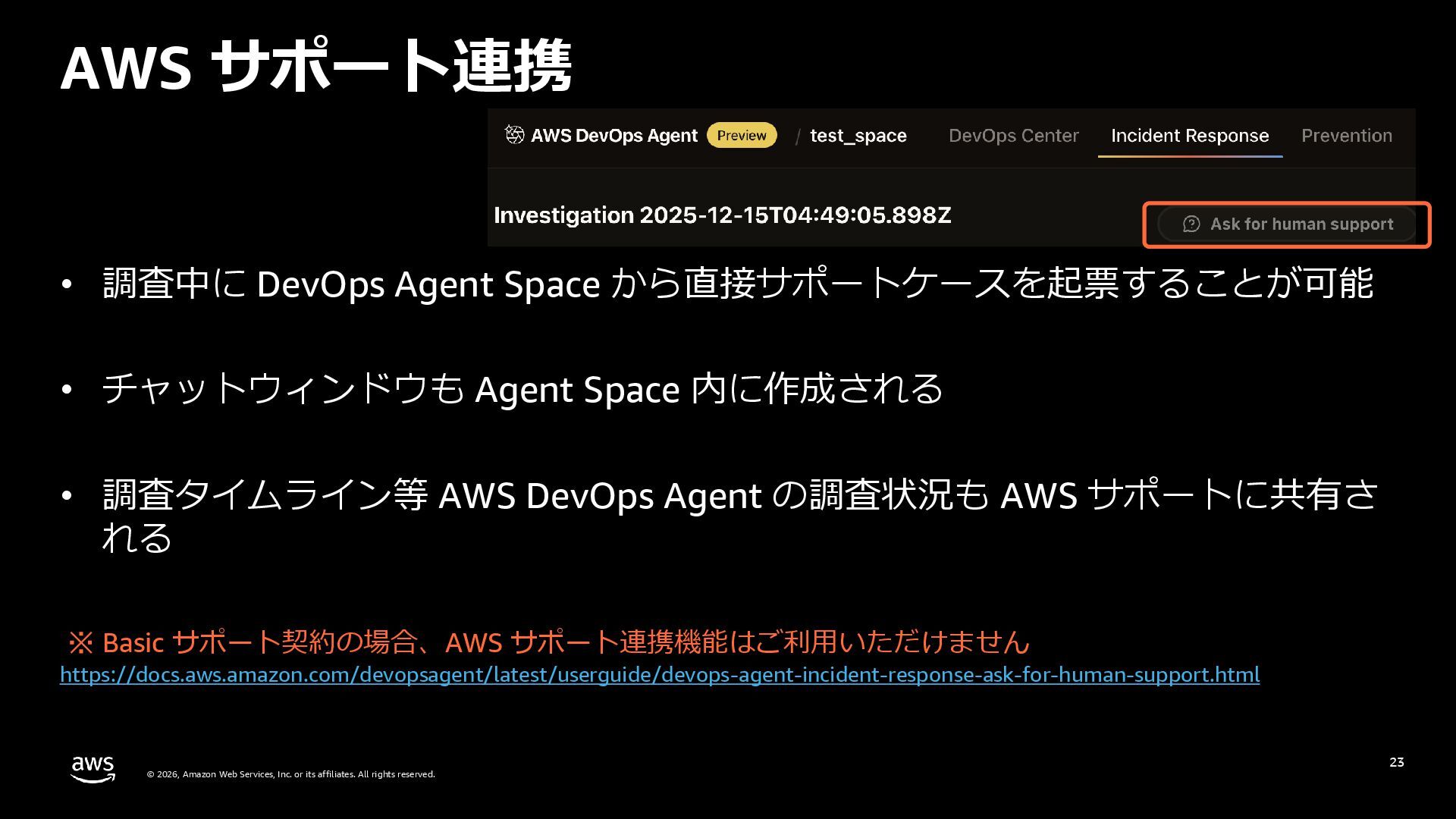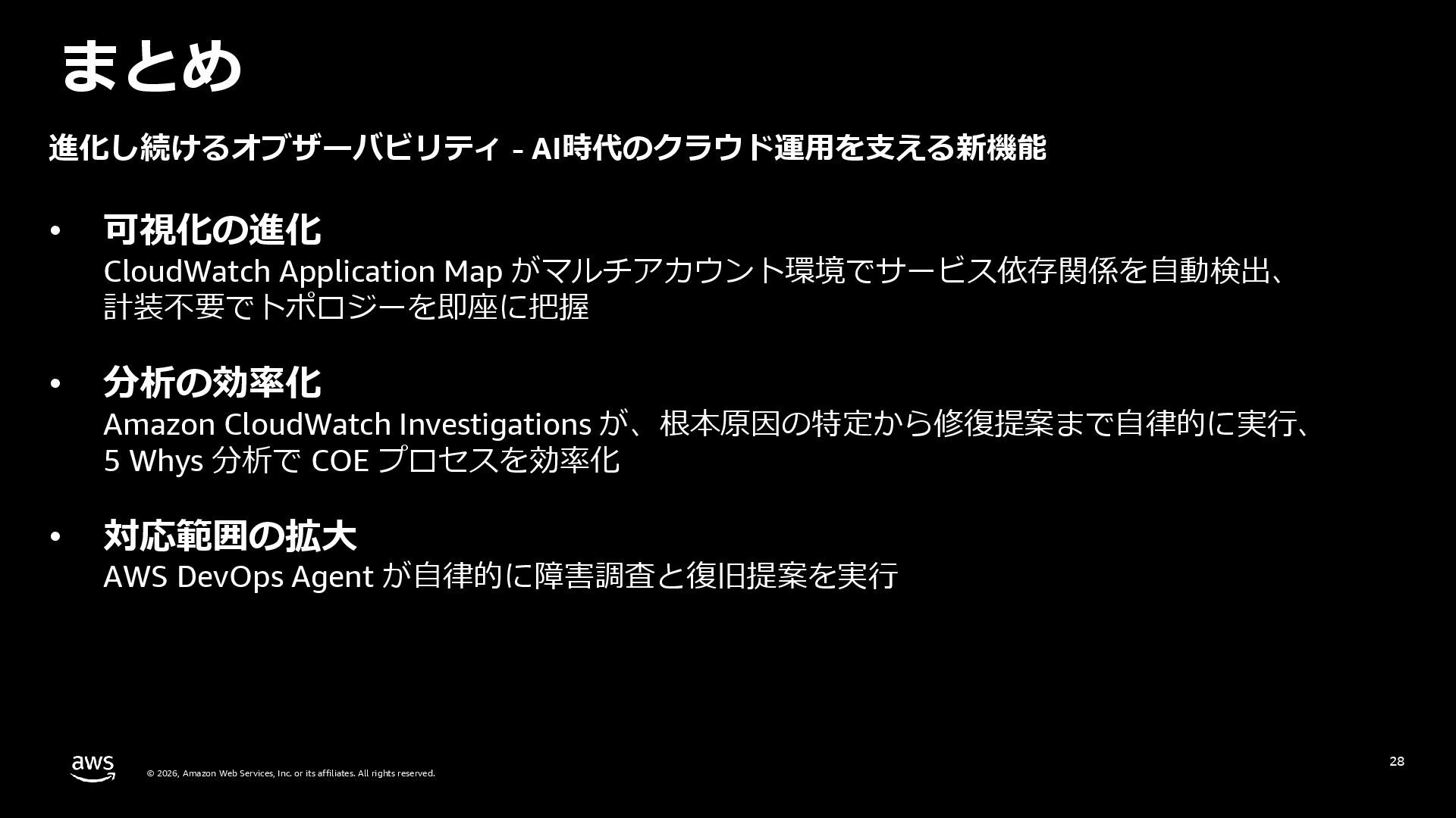 rights reserved. 27 DevOps Agent CloudWatch Investigations 料金体系 Preview 期間は無料 無料 リージョン Preview 期間は us-east-1 のみ (対象リソースは他リージョンも可) 複数リージョン対応 UI DevOps Agent Web App マネジメントコンソール クロスアカウント対応 可 要 CloudWatch Cross-Account o11y 3rd Party tool サポー ト Datadog, Dynatrace, New Relic, Splunk, ServiceNow, Slack, PagerDuty 等にデフォルト対応 MCP サーバーにより拡張可能 不可 リポジトリ& CI/CD パイプライン連携 GitHub, Gitlab 不可 修復アクション 提案のみ SSM Automation Runbook (実行にはユーザー承認が必要) Runbook 可 不可 サポート連携 可(Basic/Developer は制限有り) 不可 CloudWatch Investigations との比較