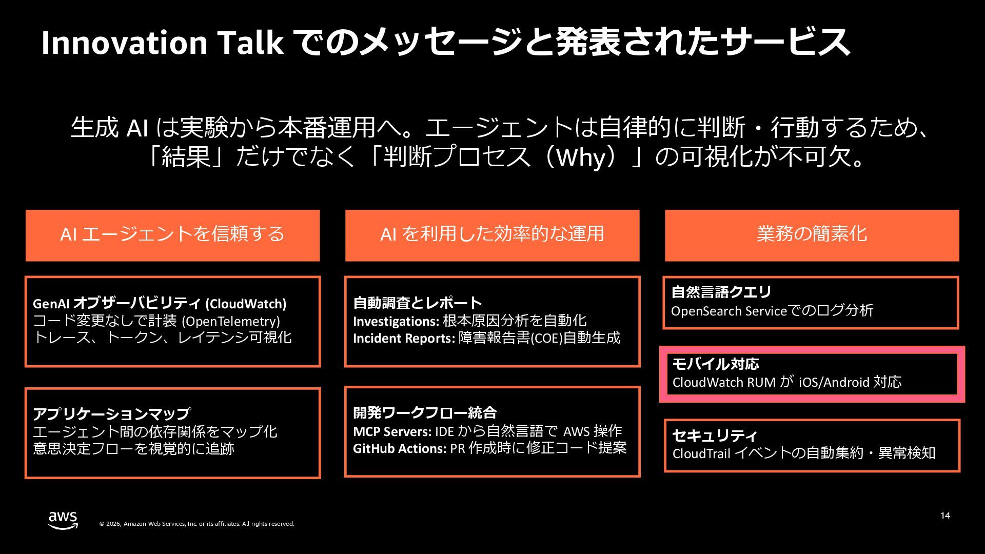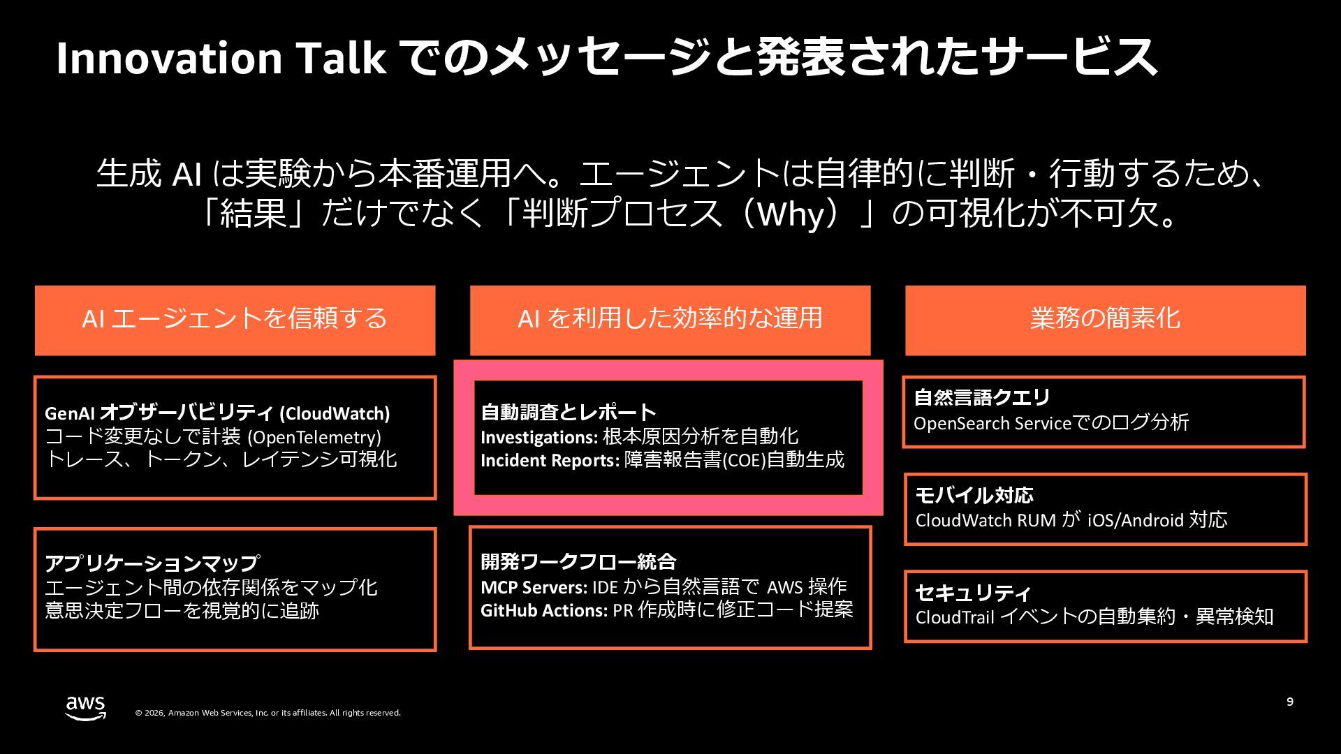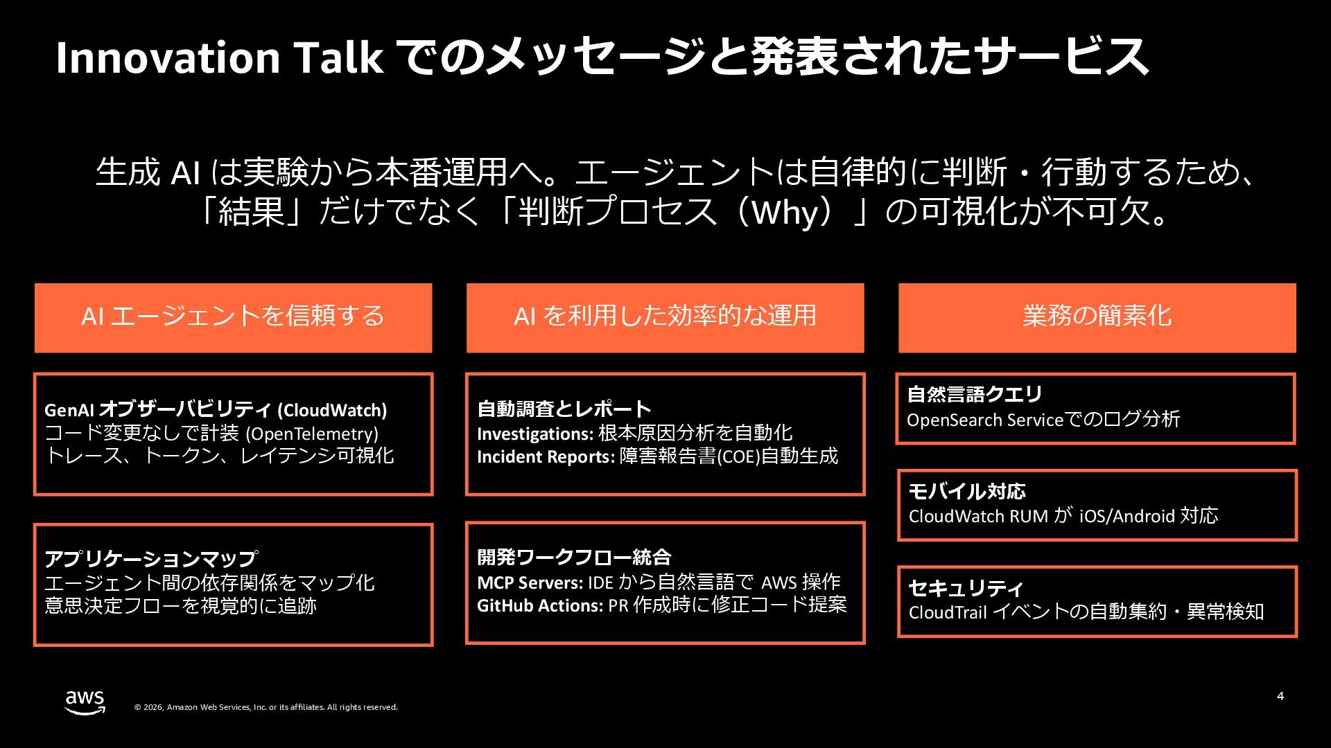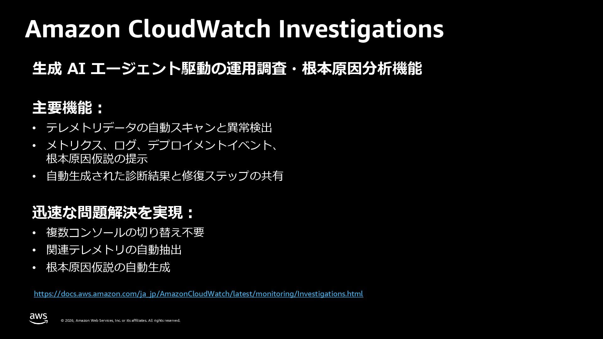 rights reserved. 27 DevOps Agent CloudWatch Investigations 料金体系 Preview 期間は無料 無料 リージョン Preview 期間は us-east-1 のみ (対象リソースは他リージョンも可) 複数リージョン対応 UI DevOps Agent Web App マネジメントコンソール クロスアカウント対応 可 要 CloudWatch Cross-Account o11y 3rd Party tool サポー ト Datadog, Dynatrace, New Relic, Splunk, ServiceNow, Slack, PagerDuty 等にデフォルト対応 MCP サーバーにより拡張可能 不可 リポジトリ& CI/CD パイプライン連携 GitHub, Gitlab 不可 修復アクション 提案のみ SSM Automation Runbook (実行にはユーザー承認が必要) Runbook 可 不可 サポート連携 可(Basic/Developer は制限有り) 不可 CloudWatch Investigations との比較
