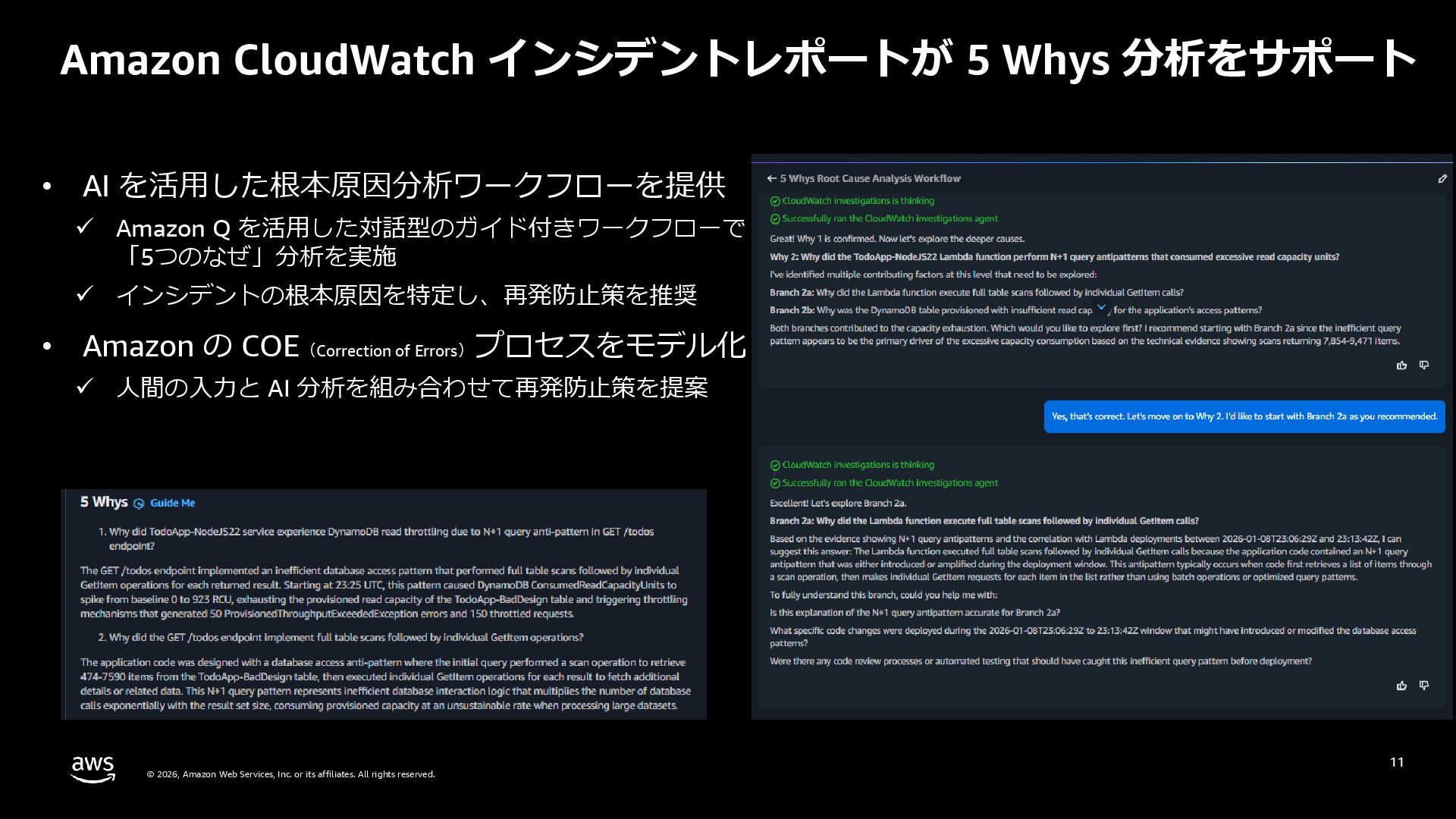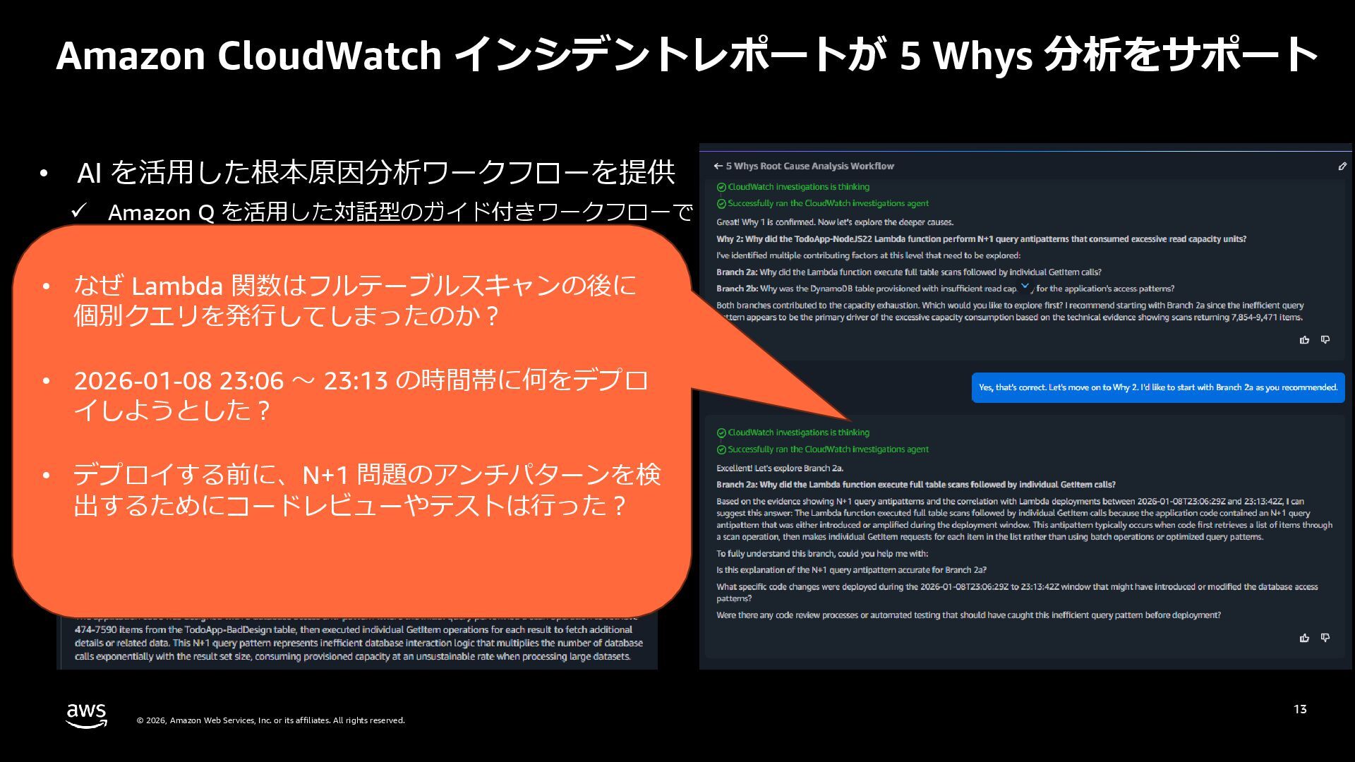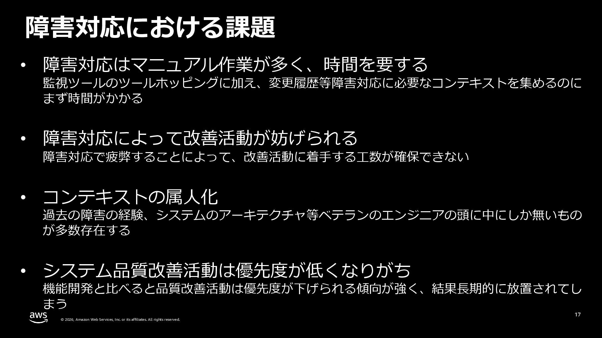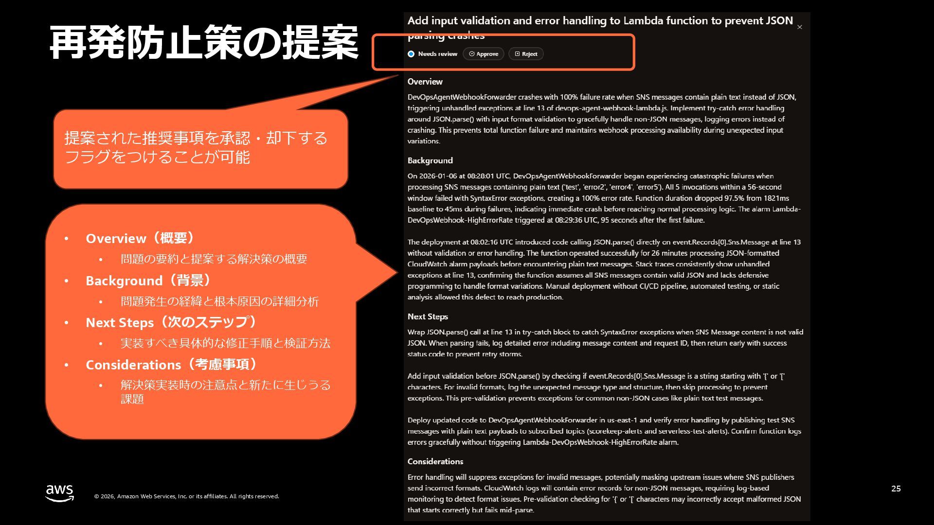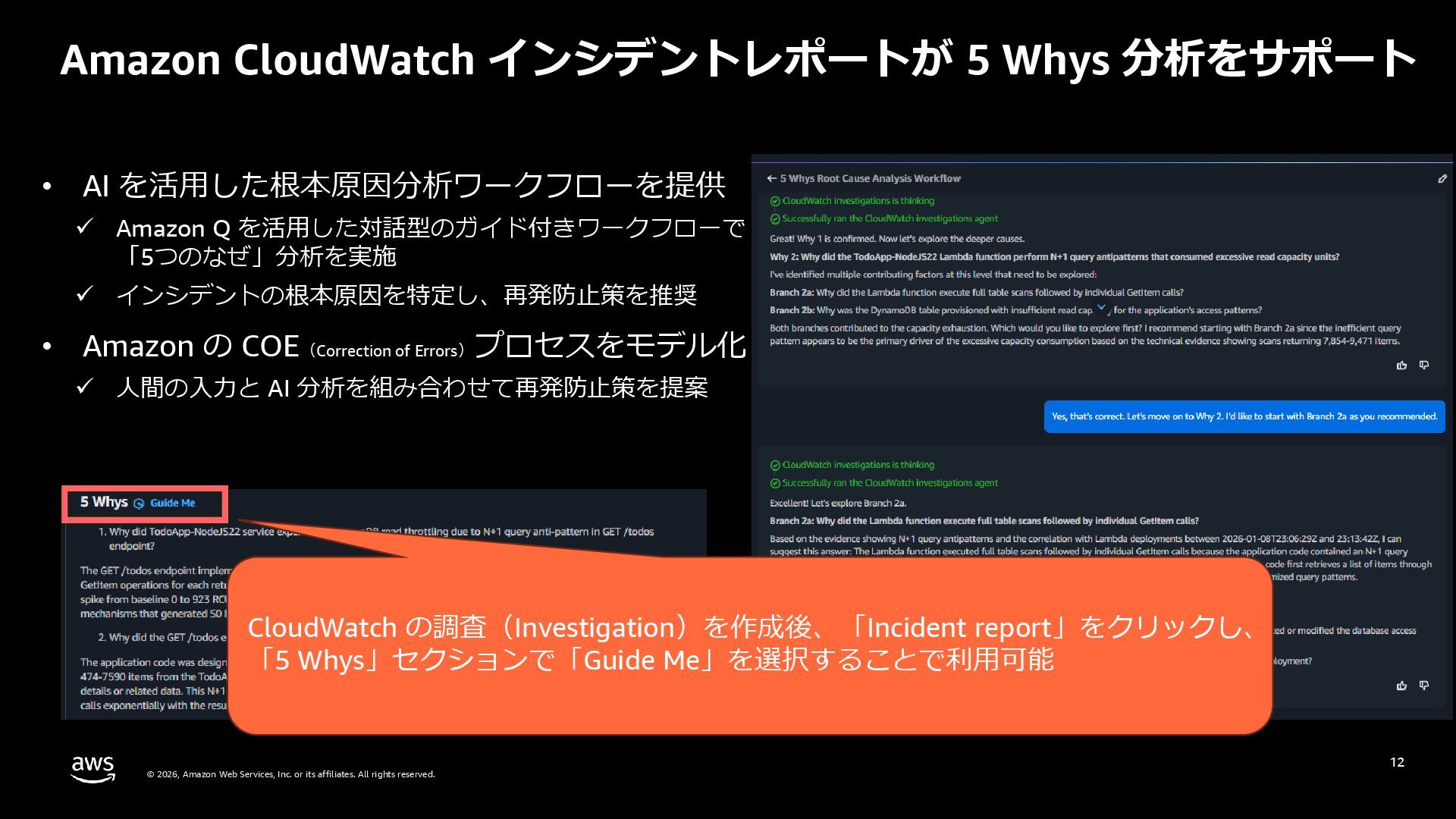 rights reserved. 27 DevOps Agent CloudWatch Investigations 料金体系 Preview 期間は無料 無料 リージョン Preview 期間は us-east-1 のみ (対象リソースは他リージョンも可) 複数リージョン対応 UI DevOps Agent Web App マネジメントコンソール クロスアカウント対応 可 要 CloudWatch Cross-Account o11y 3rd Party tool サポー ト Datadog, Dynatrace, New Relic, Splunk, ServiceNow, Slack, PagerDuty 等にデフォルト対応 MCP サーバーにより拡張可能 不可 リポジトリ& CI/CD パイプライン連携 GitHub, Gitlab 不可 修復アクション 提案のみ SSM Automation Runbook (実行にはユーザー承認が必要) Runbook 可 不可 サポート連携 可(Basic/Developer は制限有り) 不可 CloudWatch Investigations との比較