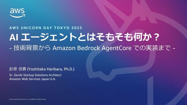 本セッションでは、AI エージェントを正しく理解し実装するために必要な技術的基盤を体系的に解説します。Chain-of-Thought などを用いた LLM の論理的推論 (reasoning) 能力の向上から、ReAct などによるエージェント研究の発展、そして Amazon Bedrock AgentCore でのマルチエージェントの実装まで、理論と実践を知ることができます。単なるツールの使い方ではなく、なぜそのアーキテクチャが有効なのかを理解し、スタートアップでの実装戦略に活かせる知見を提供します。