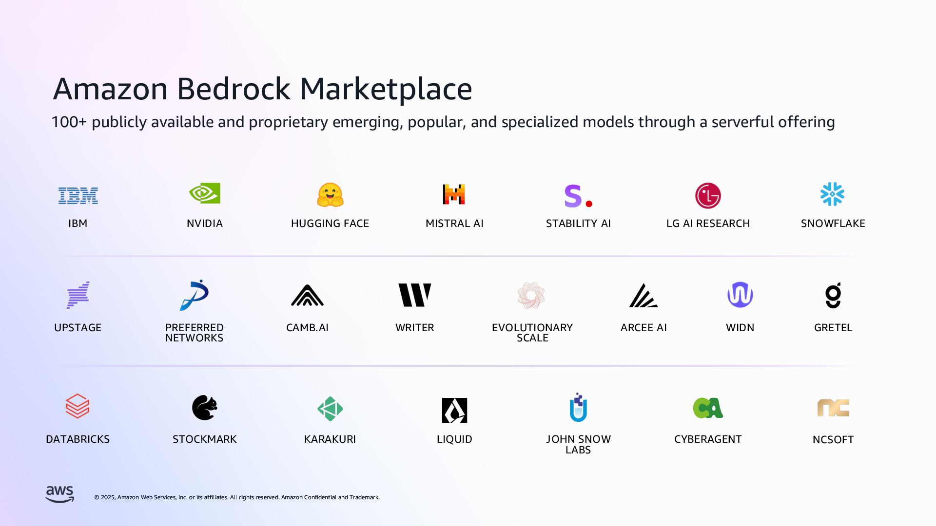rights reserved. Amazon Confidential and Trademark. Amazon Bedrock B R O A D E S T S E L E C T I O N O F F U L L Y M A N A G E D M O D E L S F R O M L E A D I N G A I C O M P A N I E S AMAZON NOVA JAMBA CLAUDE COMMAND EMBED RERANK LLAMA LUMA RAY 2 Effective reasoning & rapid analysis for long context windows High-quality AI image generation, easily deployable at scale Advanced image & language reasoning Knowledge summarization, expert agents, & code completion High-quality video generation with natural, coherent motion & ultra-realistic details Software engineering AI for large enterprises STABLE DIFFUSION MISTRAL MIXTRAL MALIBU POINT Extended thinking & coding, including computer use skills Multimodal search & advanced retrieval powering multilingual knowledge agents Coming soon Advanced reasoning, comprehension, scientific & mathematical analysis, & code generation DEEPSEEK-R1 Frontier intelligence & industry leading price performance, high-quality image & video generation