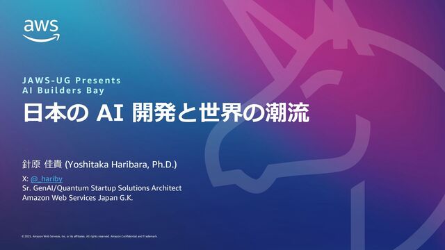 or its affiliates. All rights reserved. Amazon Confidential and Trademark. References: Robotics FM 1. 基盤モデルとロボットの融合 マルチモーダル AI でロボットはどう変わるのか (KS 理⼯学専⾨書)、河原塚健⼈、松嶋達也 (著) https://www.amazon.co.jp/dp/4065395852 2. Robotics Foundation Models (RFMs) 1. R3M https://arxiv.org/abs/2203.12601 - ResNet-based model trained with egocentric data 2. MVP https://arxiv.org/abs/2210.03109 - Vision Transformer (ViT)-based 3. Visual Cortex-1 https://arxiv.org/abs/2303.18240 - ViT-based 4. PaLM-E https://arxiv.org/abs/2303.03378 embodiment by embedding (e.g. image with ViT) concatenated with PaLM 5. RoboVQA https://arxiv.org/abs/2311.00899 - post-training of vision language model (VLM) VideoCoCa 383M with annotated action data 6. MT-Opt https://arxiv.org/abs/2104.08212 - reinforcement learning (RL) with robot arm data 7. Robotics Transformer (RT)-1 https://arxiv.org/abs/2212.06817, RT-2, and RT-X https://arxiv.org/abs/2310.08864 with Open X-Embodiment (OXE) dataset https://robotics-transformer-x.github.io 8. RT-Trajectory, RT-Sketch, Auto-RT 9. Octo https://arxiv.org/abs/2405.12213 - modular architecture based on RT-X 10. OpenVLA https://arxiv.org/abs/2406.09246 - open Vision-Langage-Action (VLA) model based on ViT (DinoV2 + SigLIP) + Llama2 7B trained on OXE dataset 11. RDT-1B https://arxiv.org/abs/2410.07864 - diffusion-based 12. π0 https://arxiv.org/abs/2410.24164v1, π0.5 https://arxiv.org/abs/2504.16054 - by Physical Intelligence (PI) 13. NoMaD 14. In-context Robot Transformer (ICRT) https://arxiv.org/abs/2408.15980 15. GraspVLA https://arxiv.org/abs/2505.03233 - pre-trained on billion-scale synthetic data 3. Dataset 1. Bridge v2 https://rail-berkeley.github.io/bridgedata/ 2. OXE https://robotics-transformer-x.github.io/ 3. DROID https://droid-dataset.github.io 4. Data Capture System 1. ALOHA 2. GELLO 3. UMI 4. Dobb-E