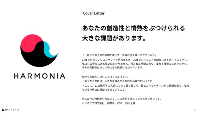 21歳で初めてシリコンバレーを訪れたとき、25歳でハルモニアを創業したとき、そして今も。私の心の中心にある問いは変わりません。残された時間に焦り、変わる環境にもがきながら、今その気持ちはひとつの大きな挑戦に向かっています。