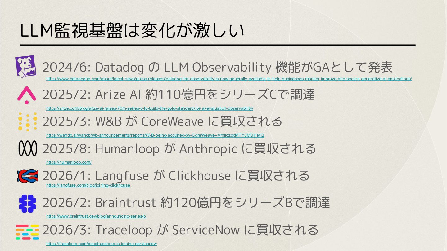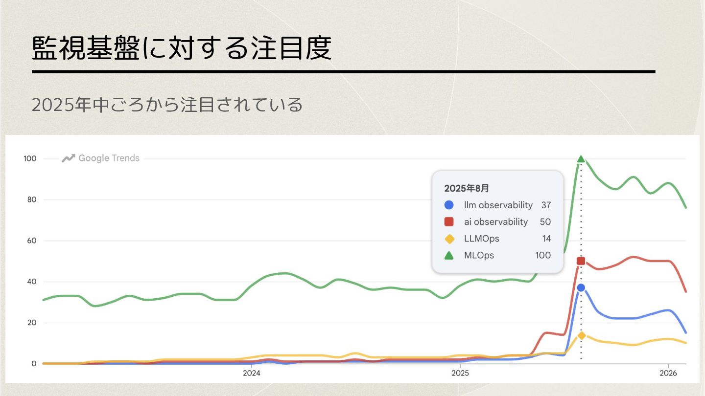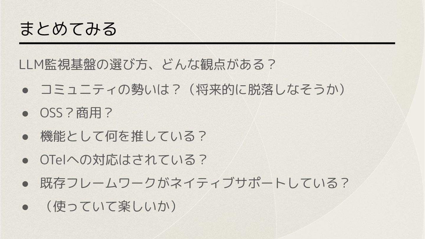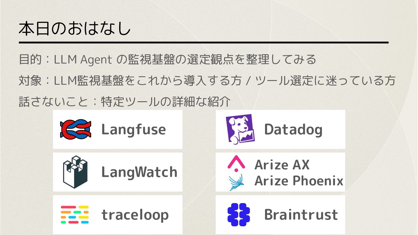 CA.ai#4 〜AIOpsの最前線〜 (https://cyberagent.connpass.com/event/383129/) で使用した資料になります。2025年後半から急激に注目を集める llm observability について、そのツール選定の大局観を整理します。