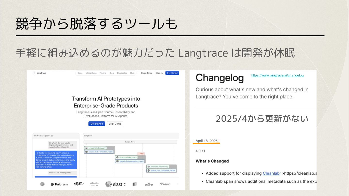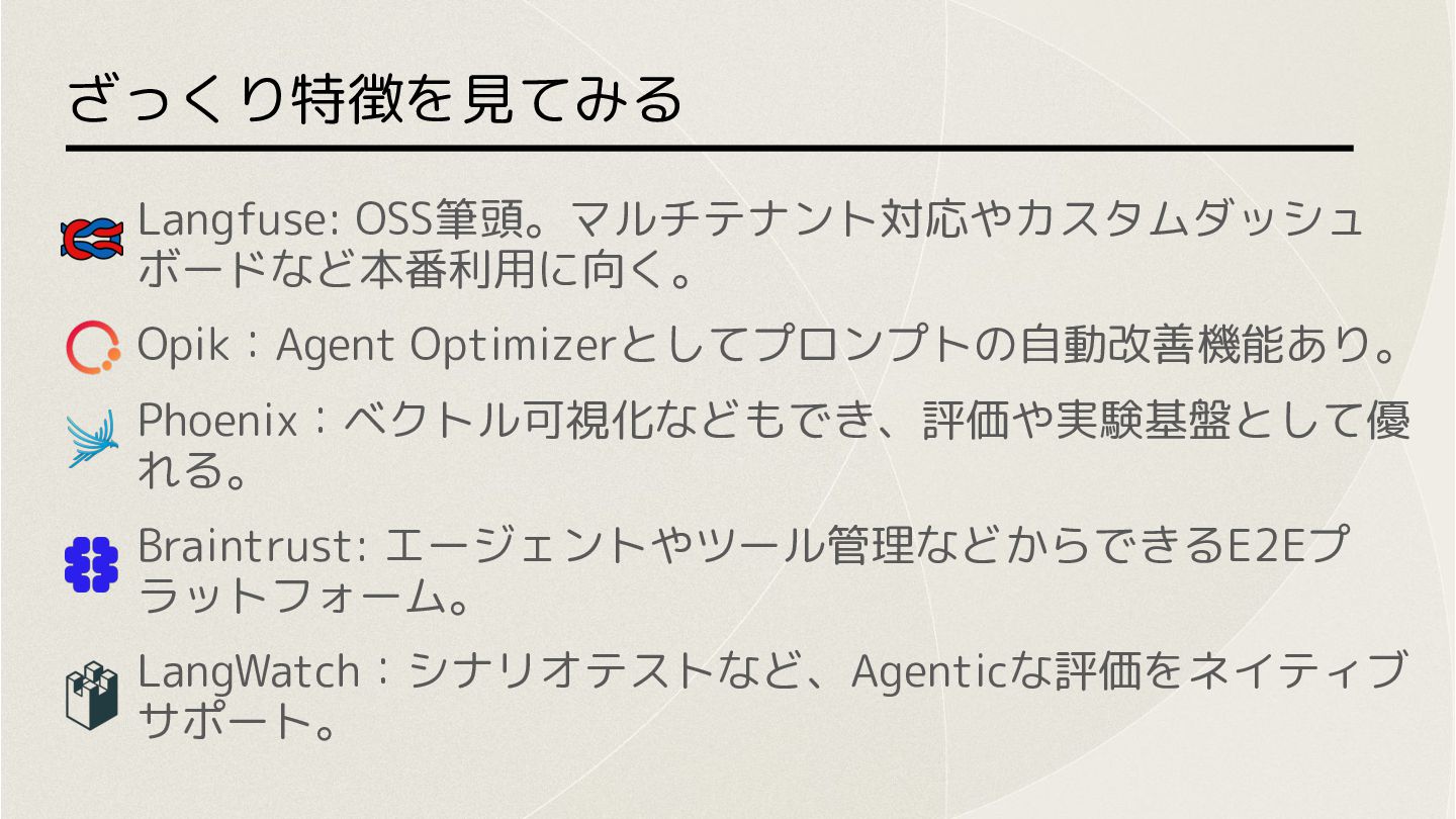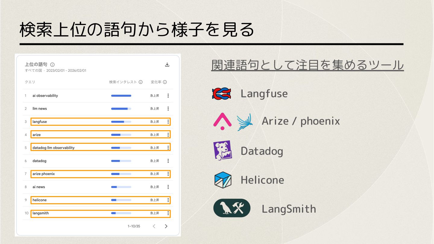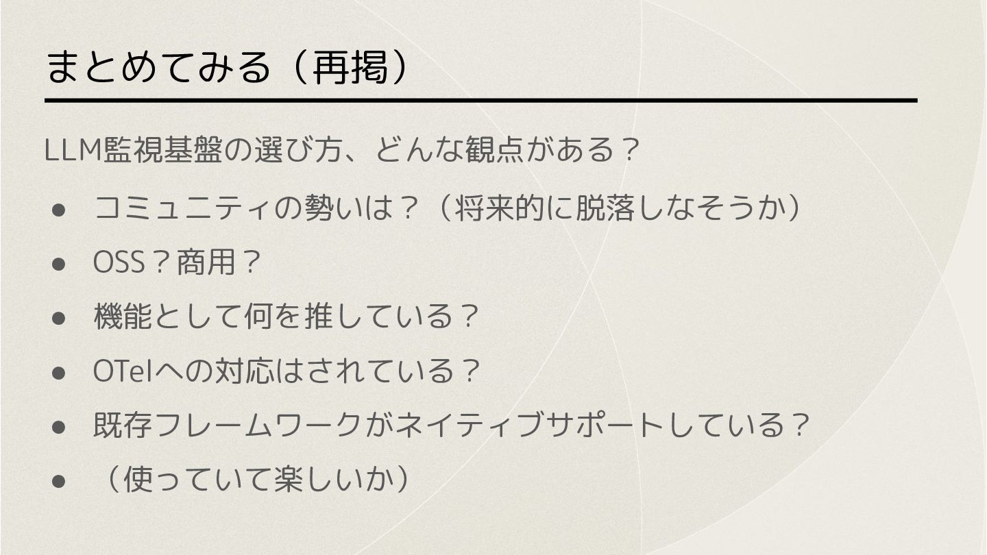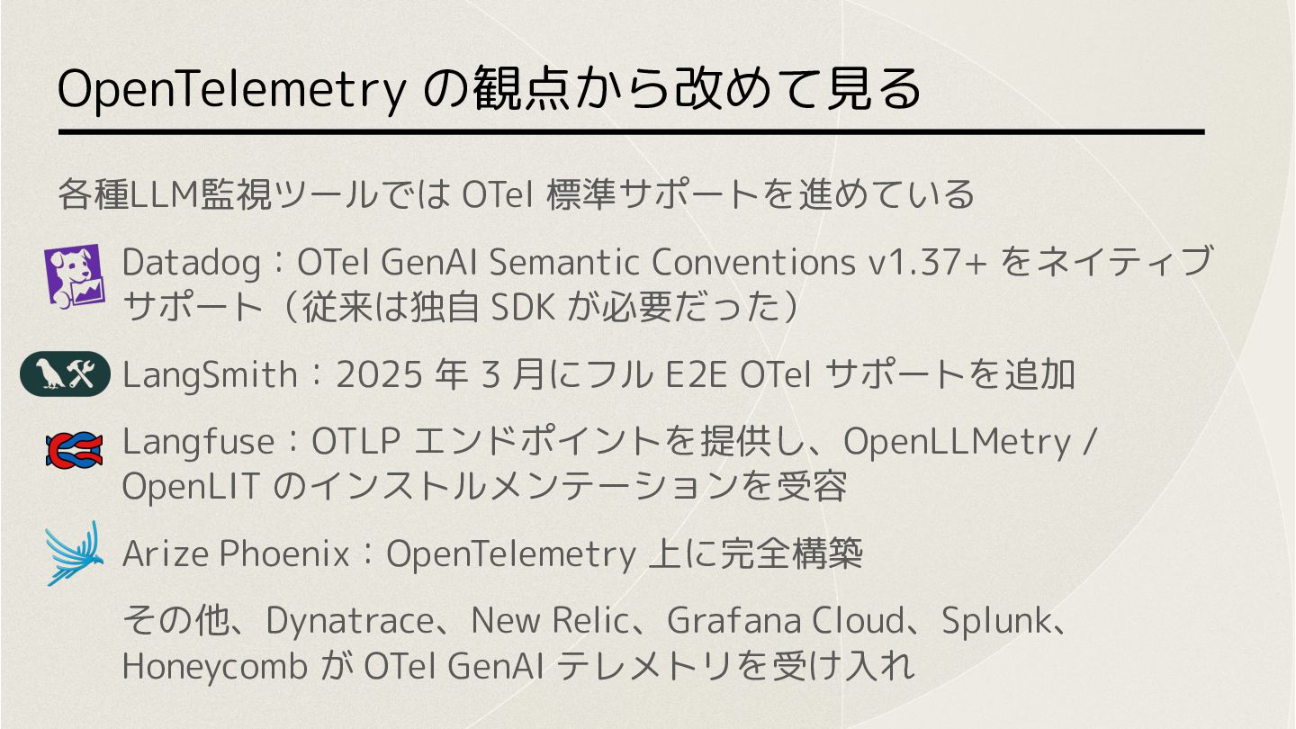 CA.ai#4 〜AIOpsの最前線〜 (https://cyberagent.connpass.com/event/383129/) で使用した資料になります。2025年後半から急激に注目を集める llm observability について、そのツール選定の大局観を整理します。