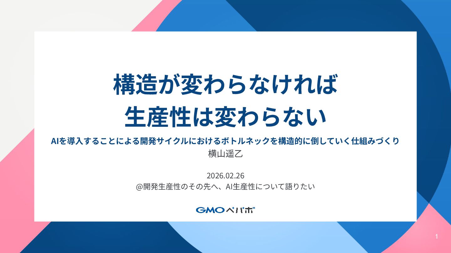 https://forkwell.connpass.com/event/384640/ 構造が変わらなければ生産性は変わらない ~AIを導入することによる開発サイクルにおけるボトルネックを構造的に倒していく仕組みづくり~