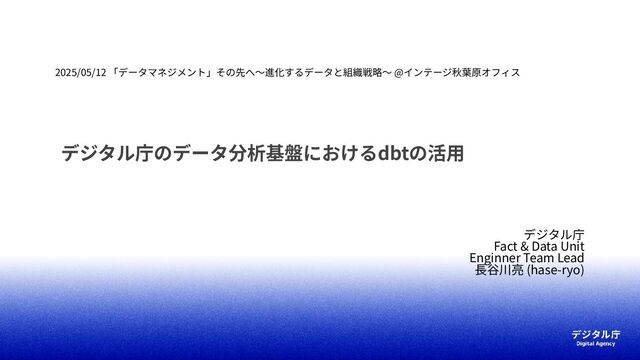 デジタル庁において 「どのようにdbtを運用しているか?」を中心に話します dbtの技術的な仕様、メリットデメリットについては、 様々な発表・記事等で触れられているので割愛 ガバナンスを考えてdbtを使っていきましょう、という内容です