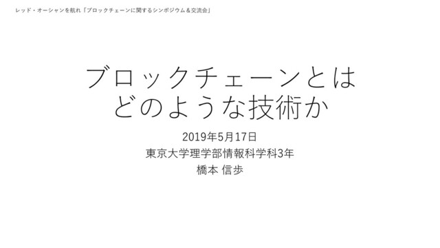 ブロックチェーンの基礎的な知識や応用先などについてのスライドです。 「ブロックチェーン社会に関するシンポジウム&交流会」における基調講演資料です (2019/05/17)。 プロフィールは: https://n-hassy.info/ja/