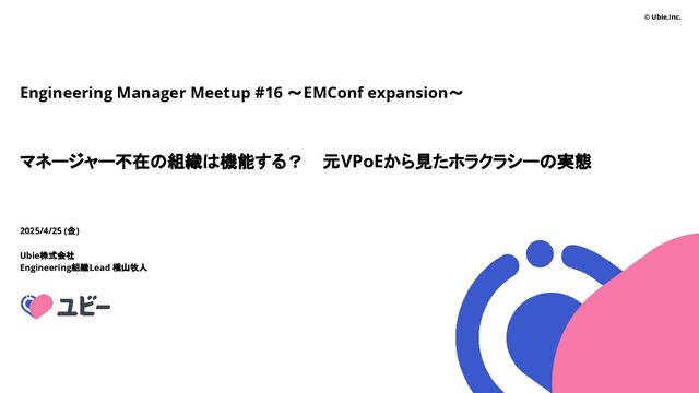 © Ubie,Inc. マネージャー不在の組織は機能する? 元VPoEから見たホラクラシーの実態 2025/4/25 (金) Ubie株式会社 Engineering組織Lead 橋山牧人 Engineering