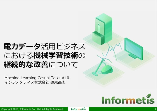 Learning Casual Talks #10 インフォメティス株式会社 蓮尾⾼志 電⼒データ活⽤ビジネス における機械学習技術の 継続的な改善について