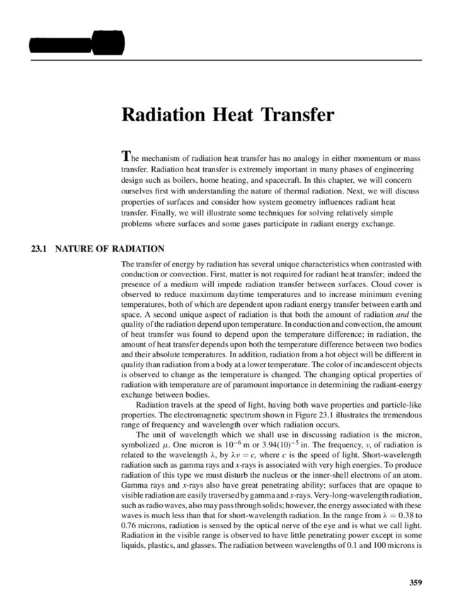 transfer has no analogy in either momentum or mass transfer. Radiation heat transfer is extremely important in many phases of engineering design such as boilers, home heating, and spacecraft. In this chapter, we will concern ourselves first with understanding the nature of thermal radiation. Next, we will discuss properties of surfaces and consider how system geometry influences radiant heat transfer. Finally, we will illustrate some techniques for solving relatively simple problems where surfaces and some gases participate in radiant energy exchange. 23.1 NATURE OF RADIATION The transfer of energy by radiation has several unique characteristics when contrasted with conduction or convection. First, matter is not required for radiant heat transfer; indeed the presence of a medium will impede radiation transfer between surfaces. Cloud cover is observed to reduce maximum daytime temperatures and to increase minimum evening temperatures, both of which are dependent upon radiant energy transfer between earth and space. A second unique aspect of radiation is that both the amount of radiation and the quality of the radiation depend upon temperature. In conduction and convection, the amount of heat transfer was found to depend upon the temperature difference; in radiation, the amount of heat transfer depends upon both the temperature difference between two bodies and their absolute temperatures. In addition, radiation from a hot object will be different in quality than radiation from a body at a lower temperature. The color of incandescent objects is observed to change as the temperature is changed. The changing optical properties of radiation with temperature are of paramount importance in determining the radiant-energy exchange between bodies. Radiation travels at the speed of light, having both wave properties and particle-like properties. The electromagnetic spectrum shown in Figure 23.1 illustrates the tremendous range of frequency and wavelength over which radiation occurs. The unit of wavelength which we shall use in discussing radiation is the micron, symbolized m. One micron is 10À6 m or 3:94(10)À5 in: The frequency, v, of radiation is related to the wavelength l, by lv ¼ c, where c is the speed of light. Short-wavelength radiation such as gamma rays and x-rays is associated with very high energies. To produce radiation of this type we must disturb the nucleus or the inner-shell electrons of an atom. Gamma rays and x-rays also have great penetrating ability; surfaces that are opaque to visible radiation are easily traversed by gamma and x-rays. Very-long-wavelength radiation, such as radiowaves, also may pass through solids; however, the energy associated with these waves is much less than that for short-wavelength radiation. In the range from l ¼ 0:38 to 0.76 microns, radiation is sensed by the optical nerve of the eye and is what we call light. Radiation in the visible range is observed to have little penetrating power except in some liquids, plastics, and glasses. The radiation between wavelengths of 0.1 and 100 microns is 359