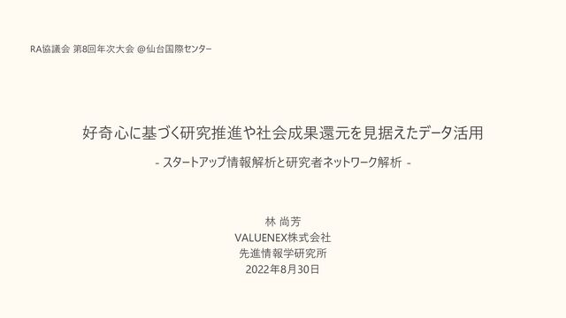「好奇心に基づく研究推進や研究成果の社会還元を見据えたデータ活用」という共通テーマで、VALUENEX社より下記の3つのトピックを発表しました。