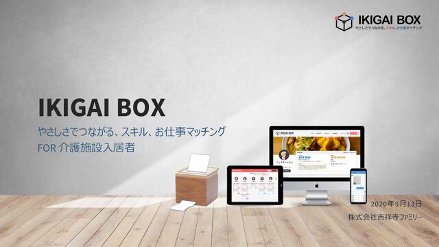 0 株式会社吉祥寺ファミリー IKIGAI BOX やさしさでつながる、スキル、お仕事マッチング FOR 介護施設⼊居者 2020年9⽉13⽇