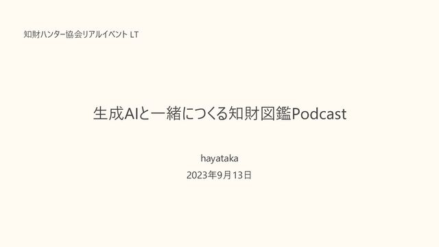 2023年9月13日に開催された「知財ハンター協会リアルイベント[1]」で、LTした発表資料です。知財図鑑の記事を、生成AIを使ってPodcast化する取り組み[2]を紹介しています。。また、生成AIによるメディアトランスフォーメーションの加速や、アイデアが埋もれてしまわないためのコミュニティの大切さもお話ししました。詳細は知財図鑑の記事でも執筆しているので[3]、興味ある方はご覧ください。