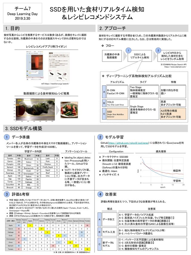 https://reed.lion.co.jp/search/ 動画撮影による食材検知&レシピ推薦 2. アプローチ 3. SSDモデル構築 食材をキレイに撮影する手間を省くため、①の冷蔵庫内動画からリアルタイムに検 知にするSSDモデル構築に注力した。なお、②は簡易的に実施した。 冷蔵庫の中身 動画撮影 レシピAPI※から 検知した食材を含む レシピをランダム取得 1 2 R-CNN Fast(er) R-CNN YOLO You Only Look Once SSD Single Shot MultiBox Detector Single Stage 直接各物体のクラス・位 置推定 高速 多オブジェクト可能 Aと同等の精度 Bより高速 多オブジェクト可能 Two Stage 物体候補推定 →候補毎に物体クラス・位 置推定 先駆け的な存在 遅い 特徴 タイプ アルゴリズム A B C ❖ ディープラーニング系物体検知アルゴリズム比較 ❖ フロー メンバー各人が自身の冷蔵庫の中身をスマホで動画撮影し、アノテーション ツールを使って、学習データを作成(計1030枚)。 1 2 3 4 データ準備 モデル学習 評価&考察 改善案 • labeling_for_object_detec tion:Processingを用い たツール。Githubで公 開。 • VoTT:マイクロソフト製。 動画から直接アノテー ション可能。出力データ に不要データが含まれ る等、一部使いにくい部 分がある。 アノテーションツール 学習データ内訳 Github(https://github.com/rykov8/ssd_keras) に公開されているssd_kerasを利 用してSSDモデルを学習。 • 学習・検証に利用していないテストデータにおいて、正解と推定結果で、bboxのIoU(重なり度合い)が 0.5以上であれば、ラベル比較をする。その他はBackgroundと認識されたと仮定。下記の混合行列は、 各正解ラベルがどのように推定されたか割合を示す。 • 課題①:少し似ているものはデータが多いものに引っ張られる傾向(Apple→Tomato、Enoki→しめじ、 Greenpepper→Aspara等) • 課題:②Cabbage→Shimeji、Spinach→Cucumberと包装等によって誤認識がされる可能性 • 課題:③そもそもBackgroundと認識されている場合が多く、領域推定に課題 • 食材 件数 Tomato 593 Carrot 559 Pumpkin 232 Spinach 188 Shimeji 165 Asparagus 142 Apple 135 Egg 122 Turnip 114 Cucumber 84 Broccoli 80 食材 件数 Leek 9 Pork 6 Chicken 5 Firefly_Squid 5 Squid 5 Beaf 4 Ume 4 食材 件数 Mushroom 72 Celery 71 Onion 55 Beansprouls 48 Enoki 47 Greenpepper 43 Daikon 39 Paprika 28 Cabbage 23 Milk 15 Orange 10 学習時 • アーキテクチャ: SSD300 • 損失関数: 位置特定誤差 (Smooth L1)と 確信度誤差 (Softmax)の重み付き和 • 最適化: Adam • バッチサイズ: 4 Configuration 損失推移 ※ EDAMAN Recipe Search API https://www.edamam.com/ データ加工 モデル工夫 新データ& モデル 観点 A-1. 学習データのバイアス低減 A-2. 高周波ノイズフィルタ(包装、ラップ等)【課題①】 A-3. 包装有無の両学習データの準備【課題②】 A-4. カット済み食材の学習(GANによる画像生成等) B-1. 他DL物体検知アルゴリズム(YOLO等) B-2. ハイパーパラメータ最適化 C-1. パッケージ文字認識による食材検知 C-2. 3次元形状の認識【課題③】 C-3. 食材の個数・量推定 C-4. 複数検知モデルのアンサンブル 改善案 A B C 評価&考察を踏まえつつ、下記のような改善案が考えられる。 SSDを用いた食材リアルタイム検知 &レシピレコメンドシステム チーム7 Deep Learning Day 2019.3.30 ※ 黄:正解、赤:誤認識割合No.1、青:誤認識割合No.2 検証時 正解\推定 Backgr ound Aspara gus Apple Broccol i Carrot Cabbag e Cucmb er Enoki Mushro om Onion Spinach Shimeji Tomato Apple 32 0 8 0 0 0 0 0 0 0 0 0 60 Carrot 33 0 0 0 67 0 0 0 0 0 0 0 0 Cabbage 35 12 0 6 0 12 0 6 0 0 0 29 0 Enoki 50 0 0 0 0 17 0 0 17 0 0 17 0 Greenpepper 87 13 0 0 0 0 0 0 0 0 0 0 0 Onion 56 0 0 0 0 0 0 11 0 28 0 6 0 Spinach 32 5 0 0 0 0 39 0 0 0 24 0 0 Tomato 41 0 0 0 0 0 0 0 0 0 0 0 59