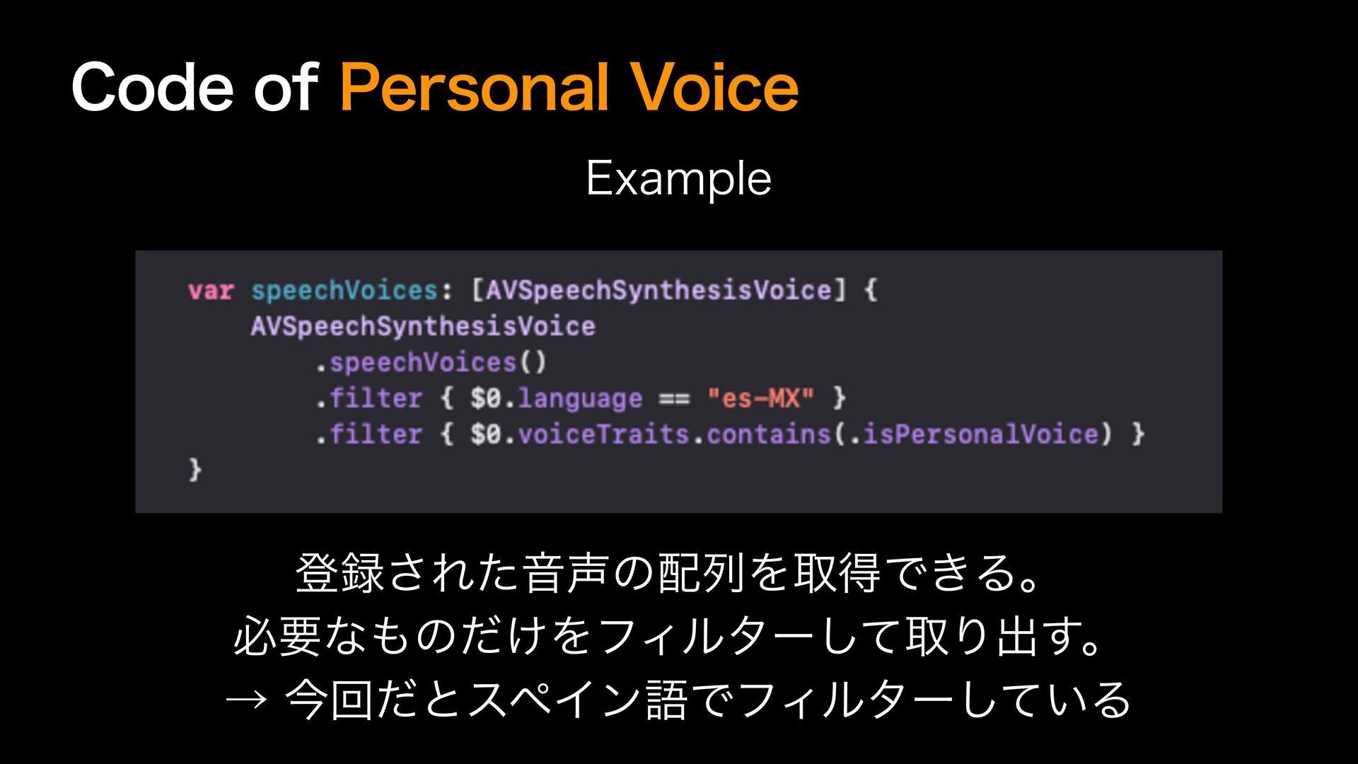$PEFPG1FSTPOBM7PJDF ొ͞ΕͨԻͷྻΛऔಘͰ͖Δɻ ඞཁͳͷ͚ͩΛϑΟϧλʔͯ͠औΓग़͢ɻ ˠࠓճͩͱεϖΠϯޠͰϑΟϧλʔ͍ͯ͠Δ &YBNQMF