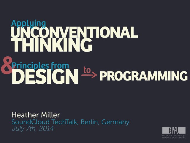directly applied to software. This talk just scratches the surface. Just an – oh hey, this looks similar! Good design is thorough to the last detail Good design is long-lasting FP especially seems to be a good fit for Ram’s design principles Awareness of design principles and some intuition of how they map to code could improve the process of building software. Others: