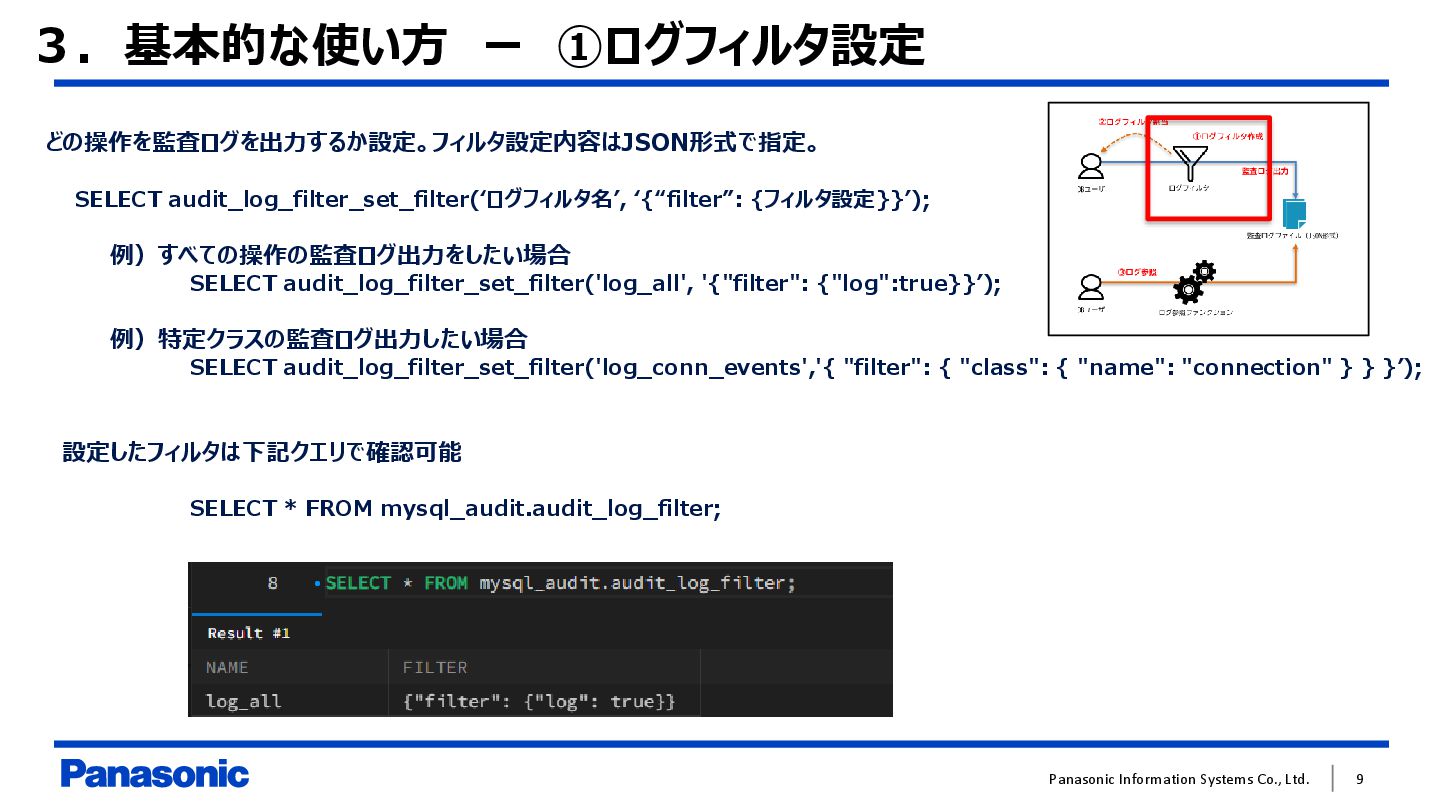 Systems Co., Ltd. CREATE TABLE if not exists audit_archive.`audit_data` ( `server_uuid` varchar(45) NOT NULL, ・ ・ ・ `command_status` varchar(40) DEFAULT NULL, `query` text DEFAULT NULL, `query_status` int DEFAULT NULL, ・ ・ ・ `server_id` varchar(80) DEFAULT NULL, `access_db` varchar(80) DEFAULT NULL, `access_table` varchar(80) DEFAULT NULL, `access_sql_command` varchar(80) DEFAULT NULL, `access_query` text DEFAULT NULL, PRIMARY KEY (`server_uuid`,`id`,`ts`) ) ENGINE=InnoDB DEFAULT CHARSET=utf8mb4 COLLATE=utf8mb4_0900_ai_ci; ▪テーブル定義変更 赤字部分を追加・修正 ▪pythonスクリプトを変更 赤字部分を追加・修正 audit_sql1 = ("SELECT @@server_uuid as server_uuid, id, ts, class, event, the_account,login_ip,login_os,login_user,login_proxy,connection_id,db, " " status,connection_type,connect_os,pid,_client_name,_client_version, " " program_name,_platform,command,sql_command,command_status,query, " " query_status,start_server_id,server_os_version,server_mysqlversion,args, " " account_host,mysql_version,the_os,the_os_ver,server_id, " " access_db, access_table, access_sql_command, access_query “ ・ ・ ・ " query TEXT PATH '$.general_data.query’, “ " query_status INT PATH '$.general_data.status', " ・ ・ ・ " server_id VARCHAR(80) PATH '$.startup_data.server_id', " " access_db VARCHAR(80) PATH '$.table_access_data.db', " " access_table VARCHAR(80) PATH '$.table_access_data.table', " " access_sql_command VARCHAR(40) PATH '$.table_access_data.sql_command', " " access_query TEXT PATH '$.table_access_data.query' " " ) " ") AS auditdata; ")