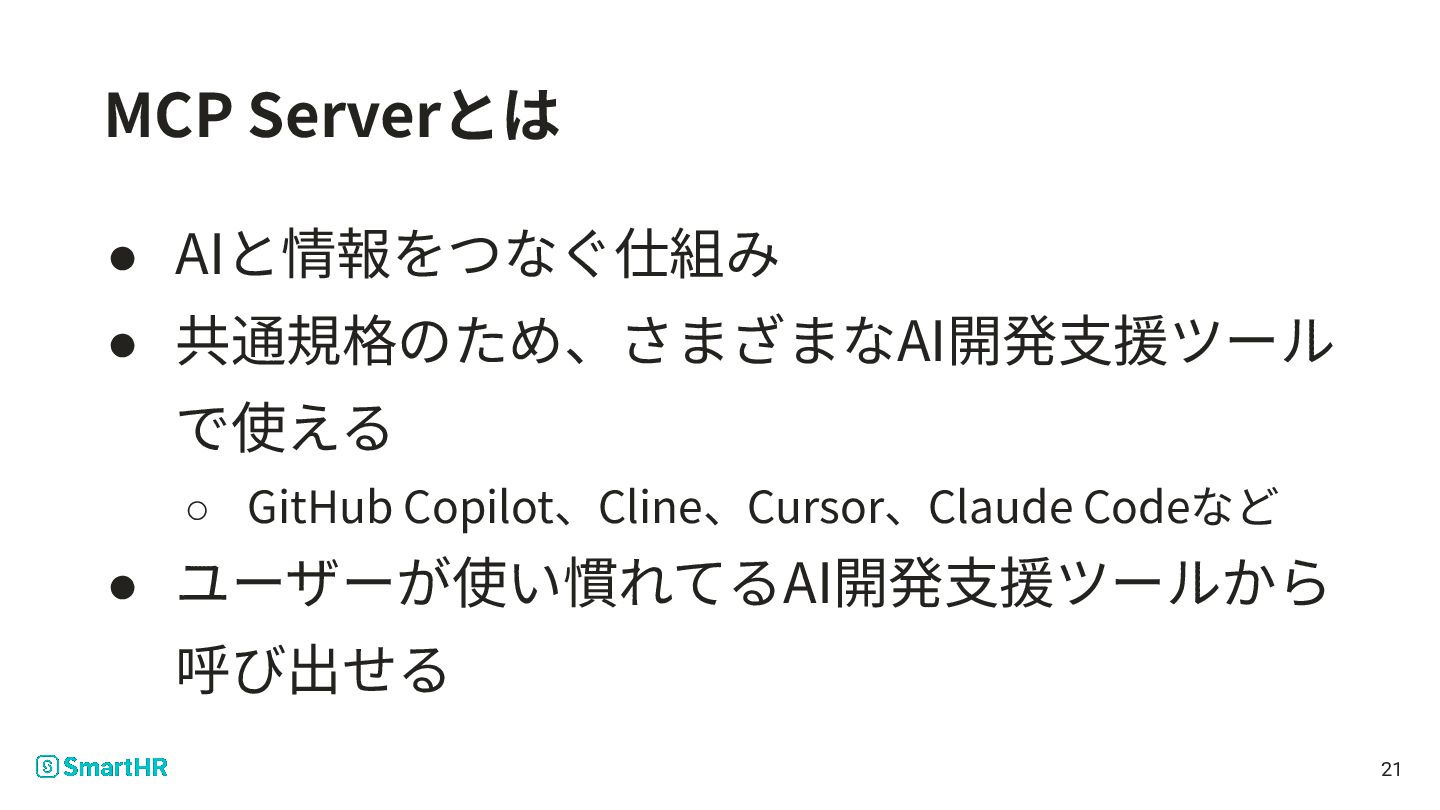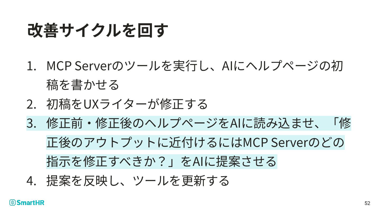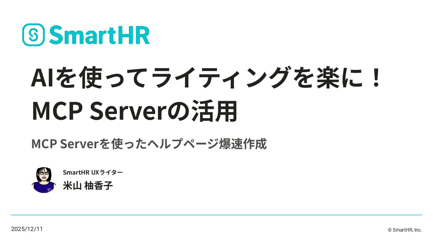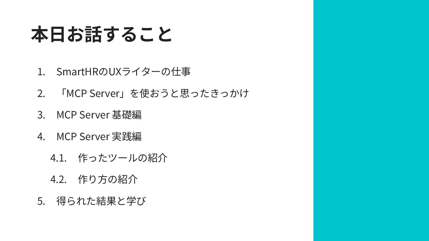 3. 本⽇お話すること 1. SmartHRのUXライターの仕事 2. 「MCP Server」を使おうと思ったきっかけ 3. MCP Server 基礎編