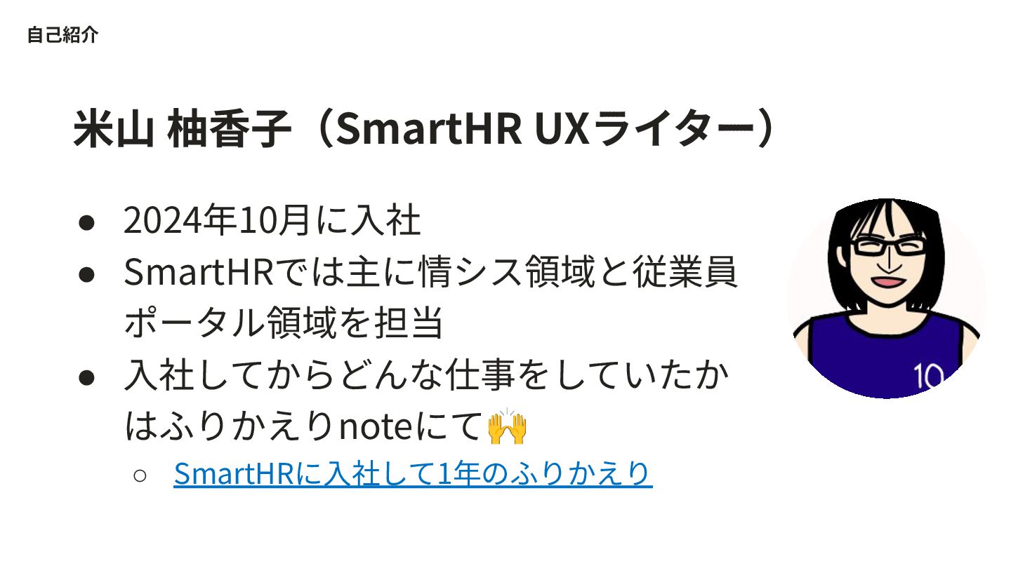 1. ⽶⼭ 柚⾹⼦(SmartHR UXライター) ⾃⼰紹介 • 2024年10⽉に⼊社 • SmartHRでは主に情シス領域と従業員 ポータル領域を担当 •