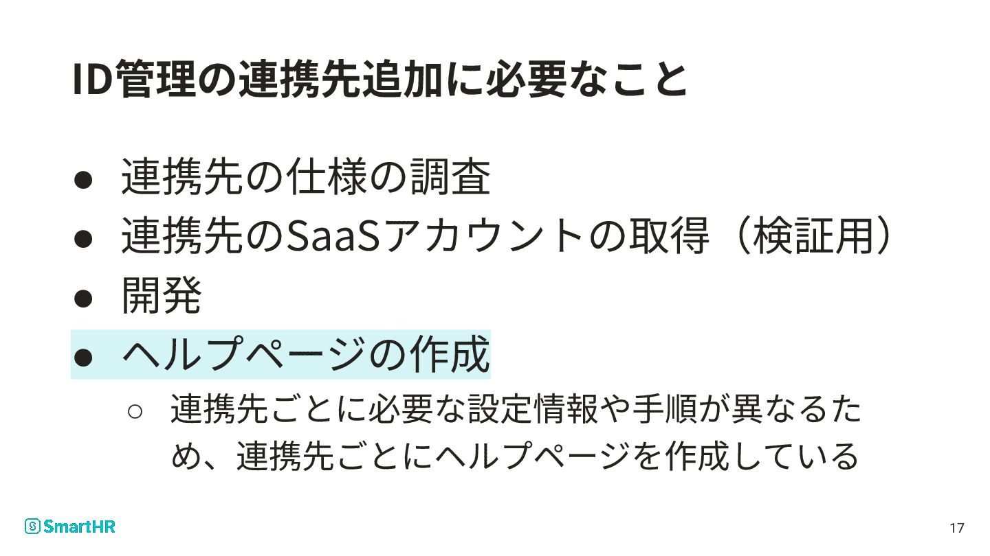 6. ID管理の連携先追加に必要なこと • 連携先の仕様の調査 • 連携先のSaaSアカウントの取得(検証⽤) • 開発 • ヘルプページの作成 ◦