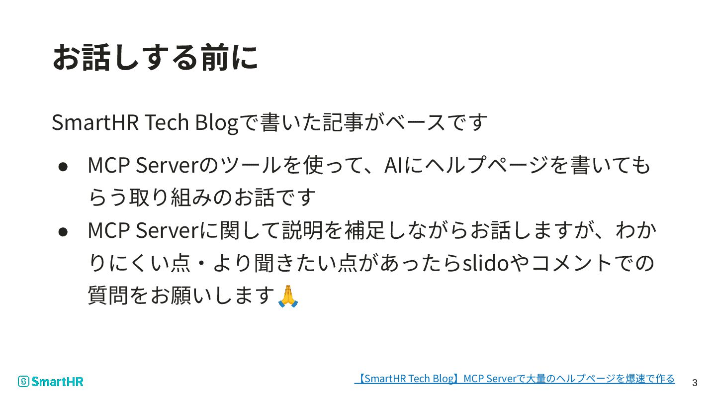 Serverに関して説明を補⾜しながらお話しますが、わか りにくい点‧より聞きたい点があったらslidoやコメントでの 質問をお願いします🙏 3 【SmartHR Tech Blog】MCP Serverで⼤量のヘルプページを爆速で作る