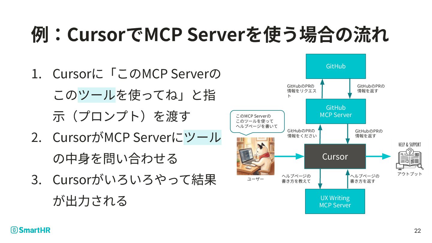 の中⾝を問い合わせる 3. Cursorがいろいろやって結果 が出⼒される 22 このMCP Serverの このツールを使って ヘルプページを書いて UX Writing MCP Server GitHub MCP Server GitHub GitHubのPRの 情報をリクエス ト GitHubのPRの 情報を返す Cursor GitHubのPRの 情報をください GitHubのPRの 情報を返す ヘルプページの 書き⽅を教えて ヘルプページの 書き⽅を返す ユーザー アウトプット