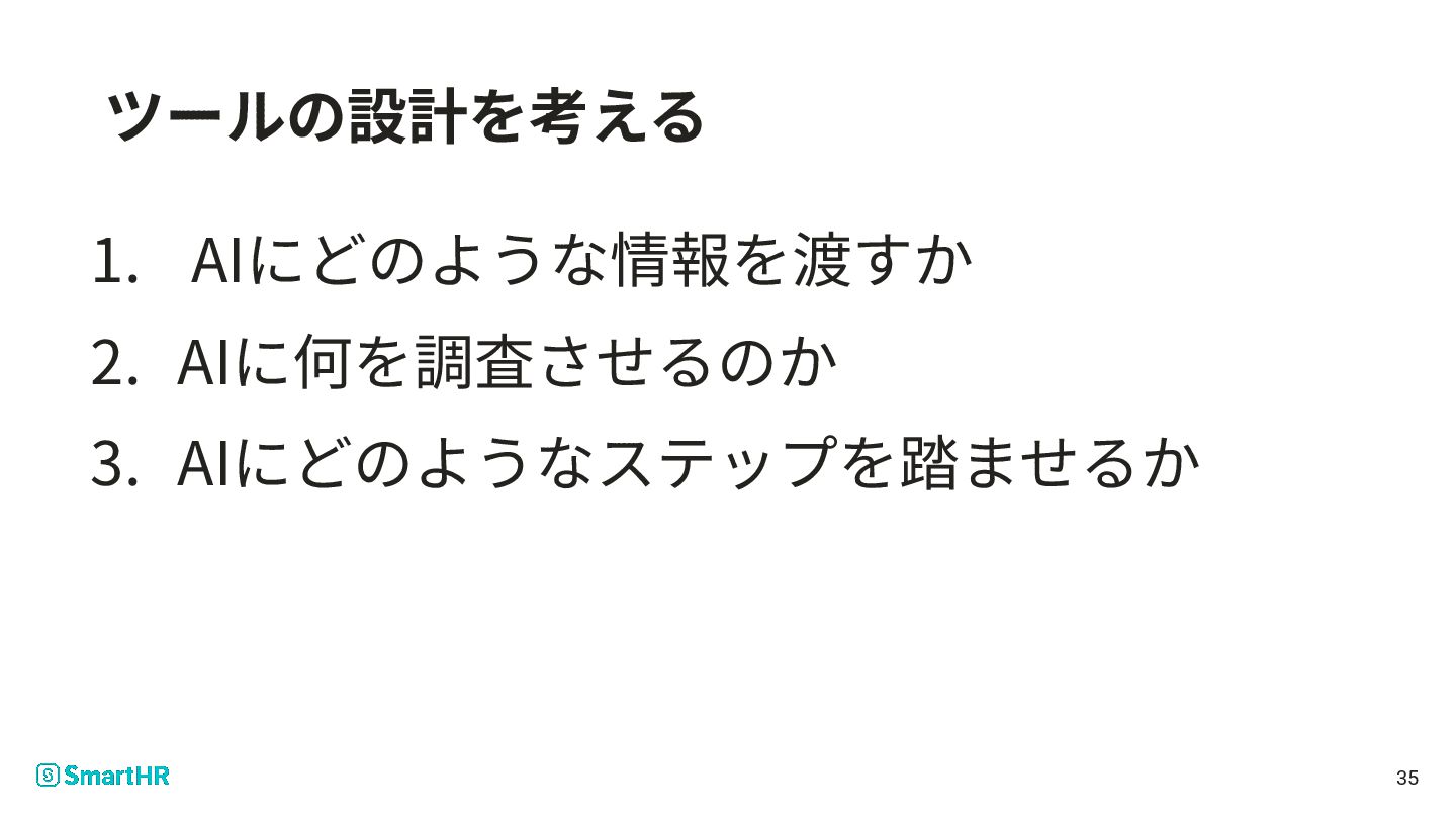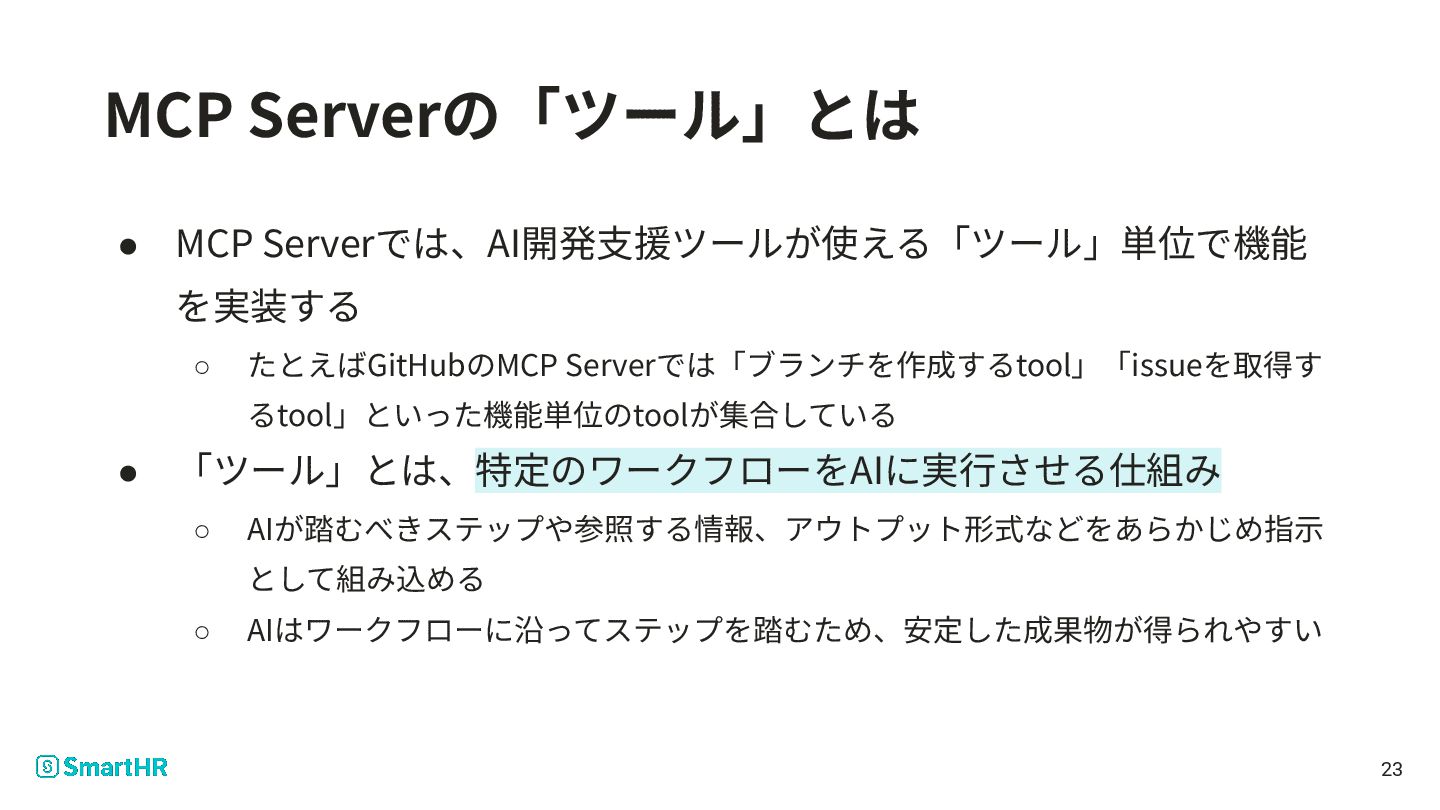 • 「ツール」とは、特定のワークフローをAIに実⾏させる仕組み ◦ AIが踏むべきステップや参照する情報、アウトプット形式などをあらかじめ指⽰ として組み込める ◦ AIはワークフローに沿ってステップを踏むため、安定した成果物が得られやすい 23