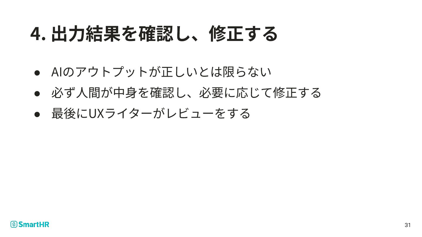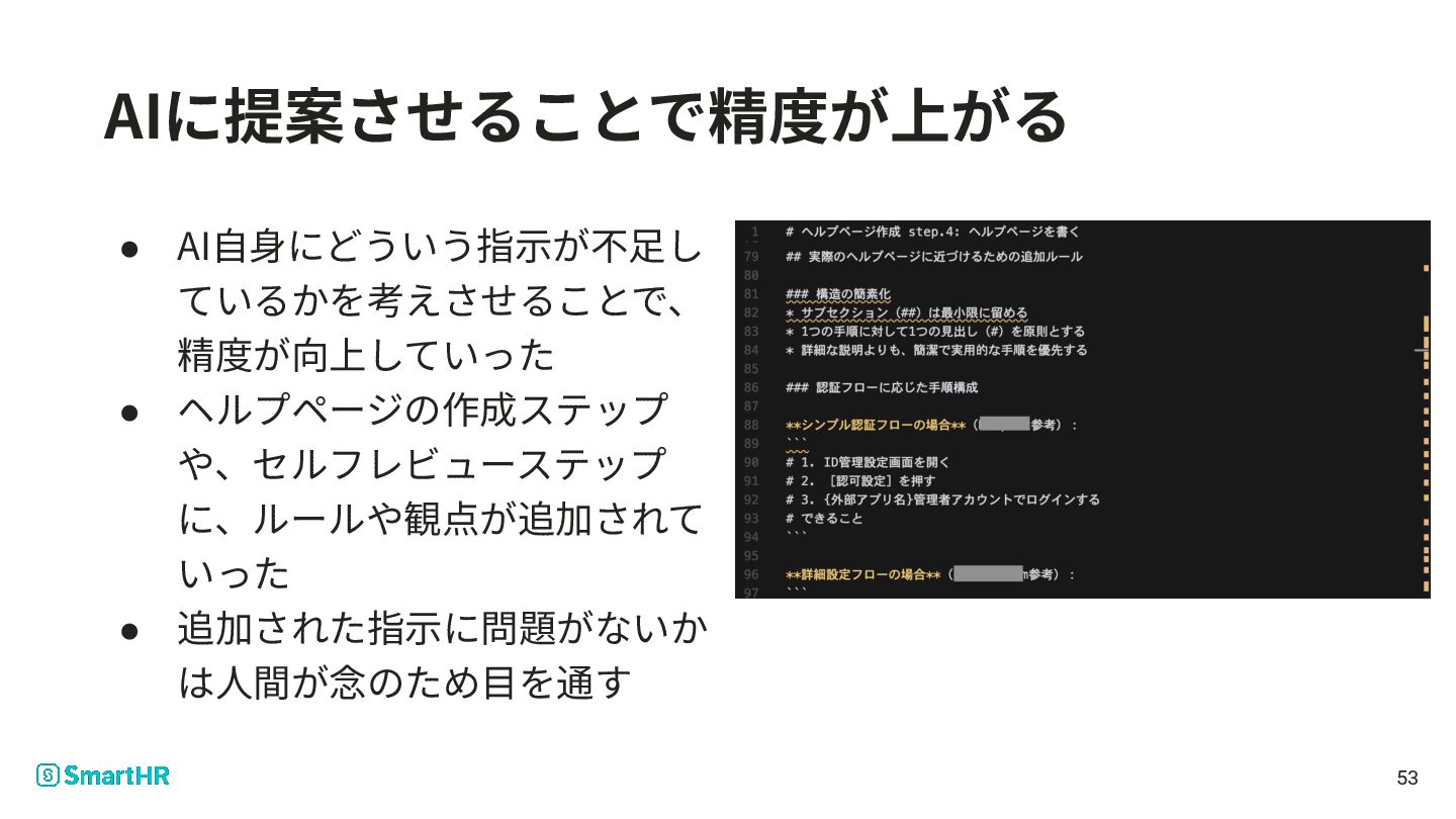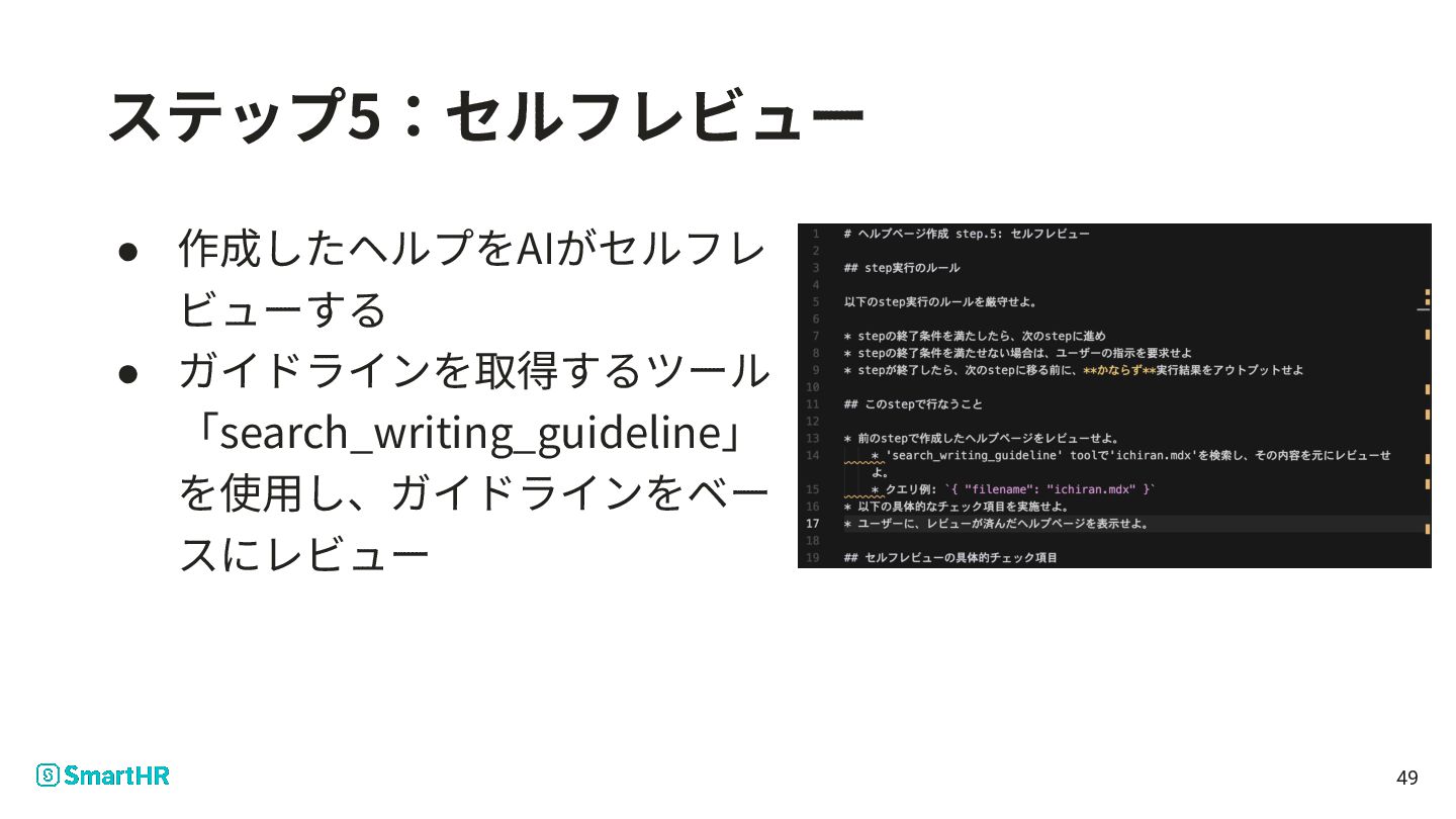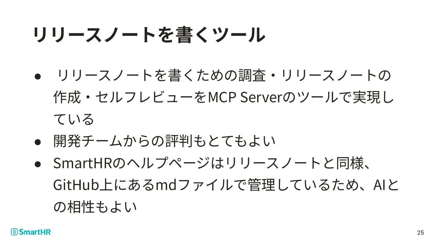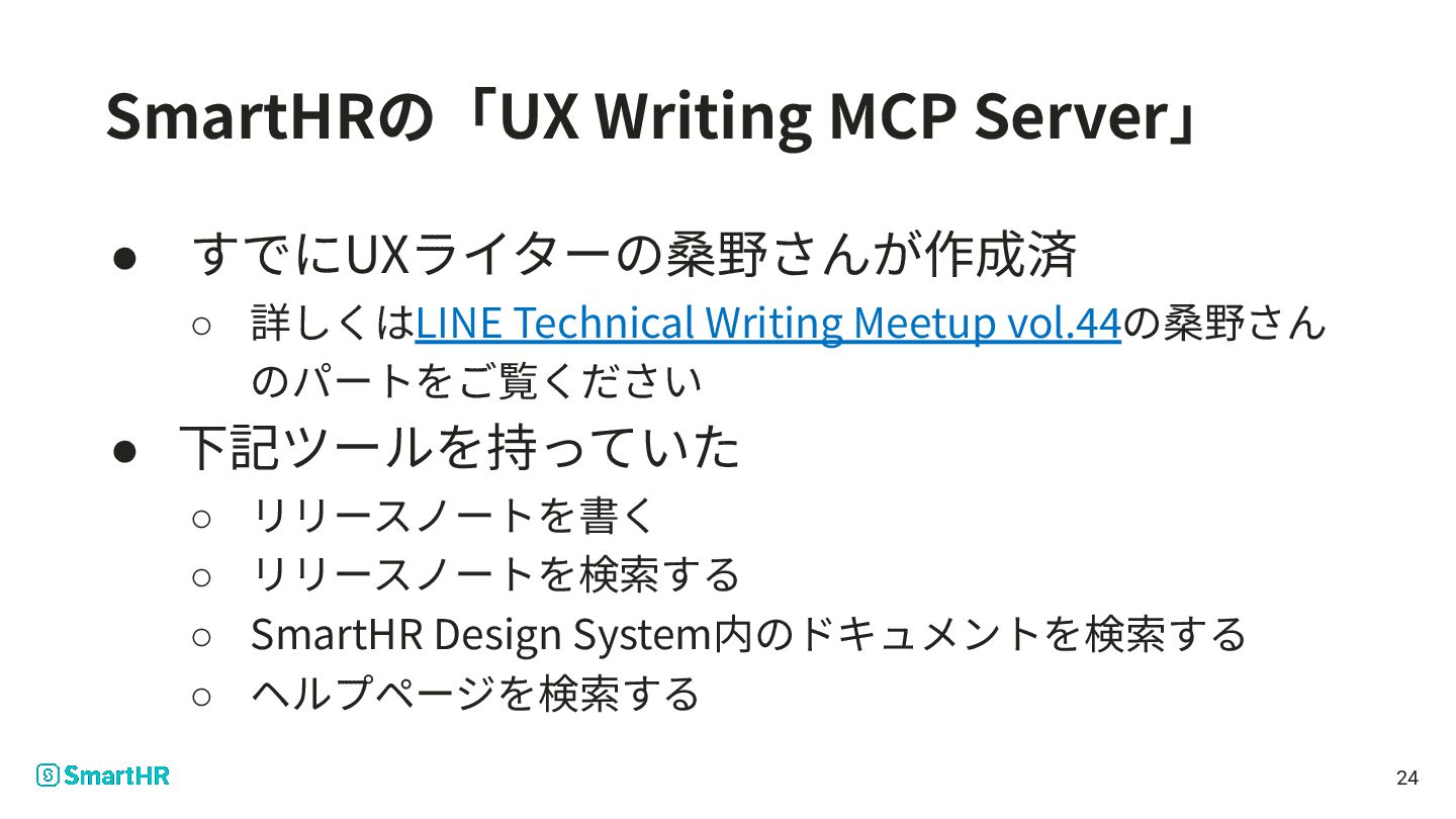 Meetup vol.44の桑野さん のパートをご覧ください • 下記ツールを持っていた ◦ リリースノートを書く ◦ リリースノートを検索する ◦ SmartHR Design System内のドキュメントを検索する ◦ ヘルプページを検索する 24