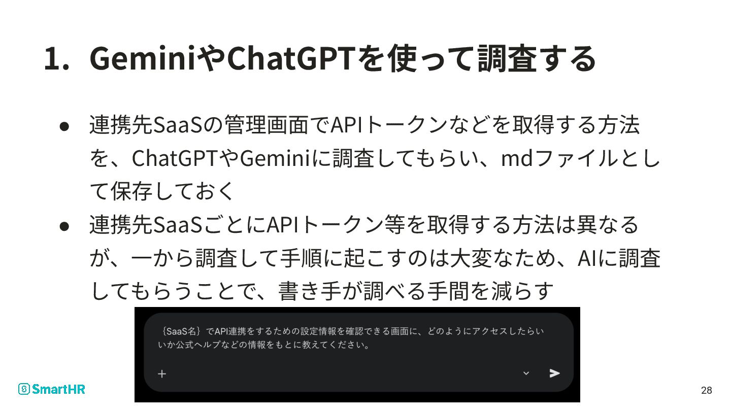 Design Doc(設計ドキュメント) • 別途AIに調査させた情報 ◦ 連携先SaaSの管理画⾯でAPIトークンなどを取得する ⽅法を、ChatGPTやGeminiに調査してもらった結果 37