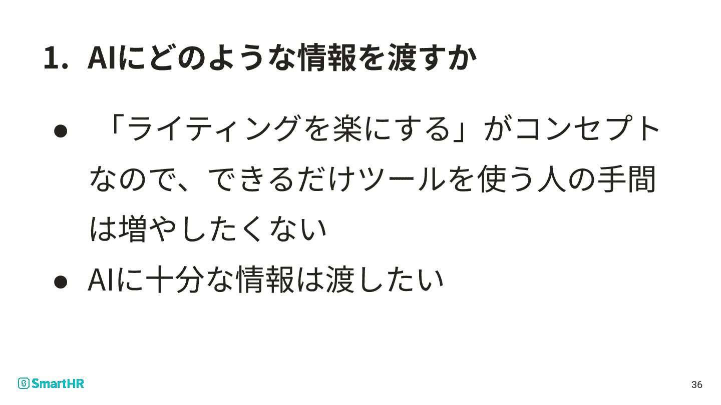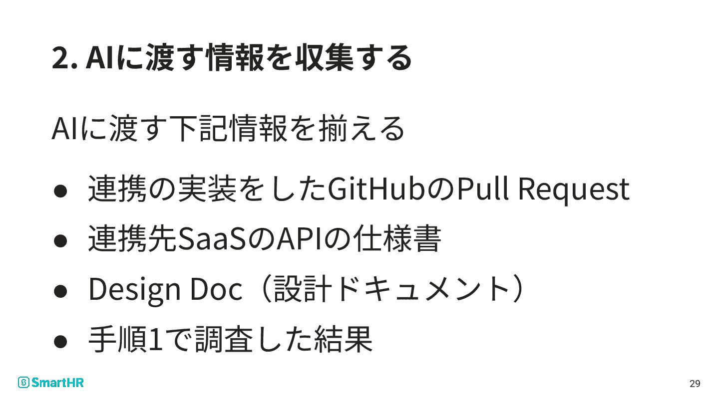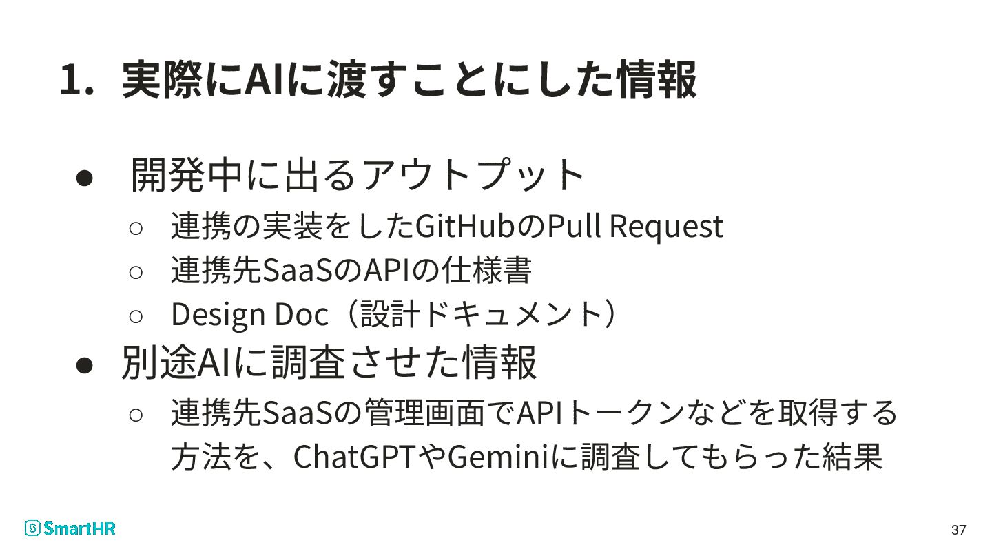10. 1. 実際にAIに渡すことにした情報 • 開発中に出るアウトプット ◦ 連携の実装をしたGitHubのPull Request ◦ 連携先SaaSのAPIの仕様書 ◦
