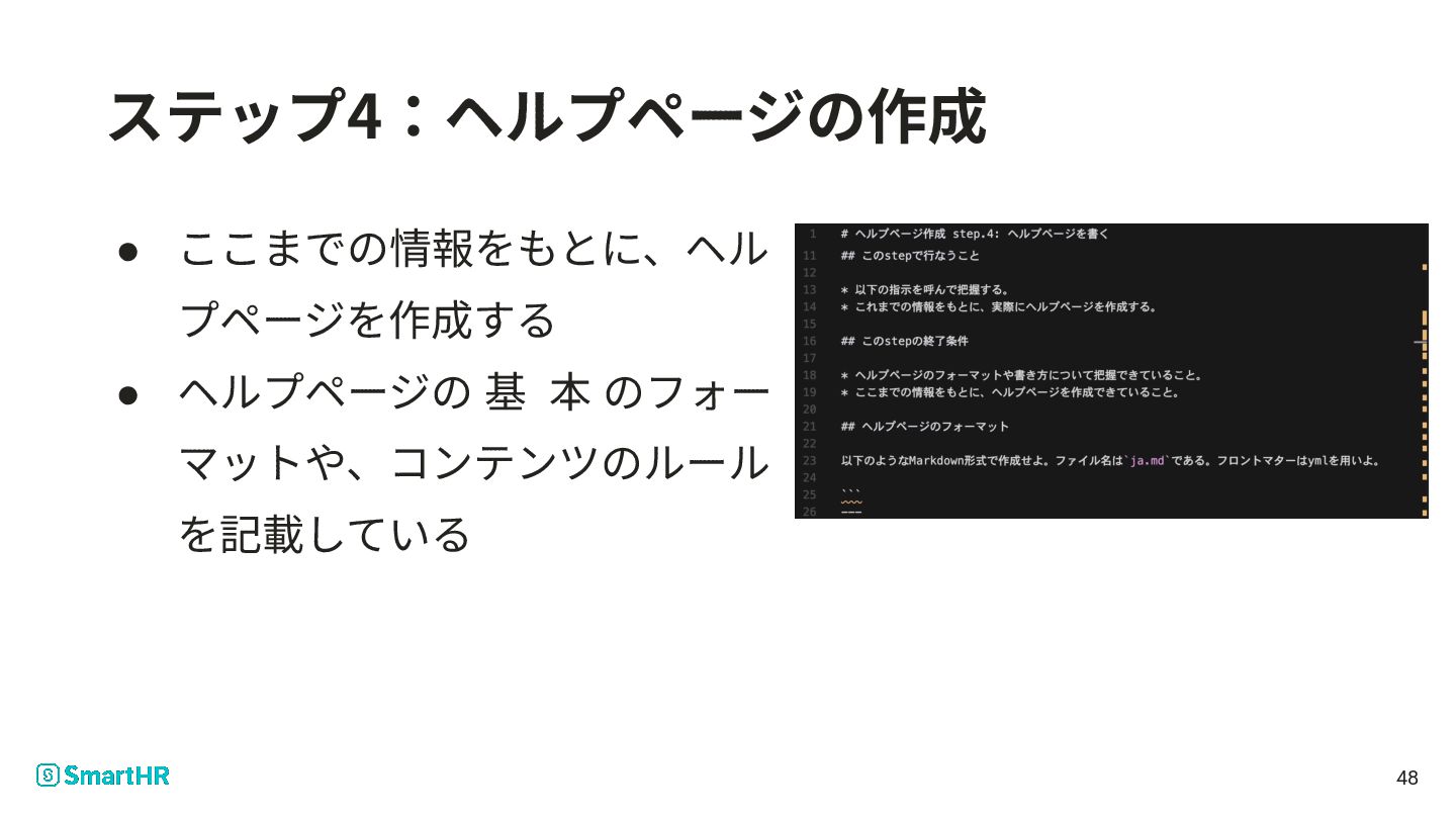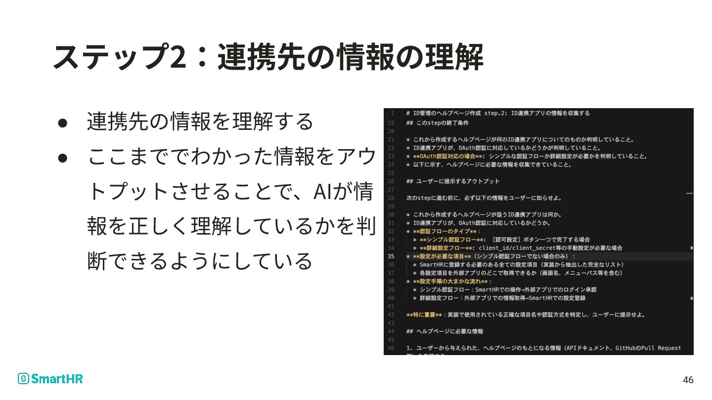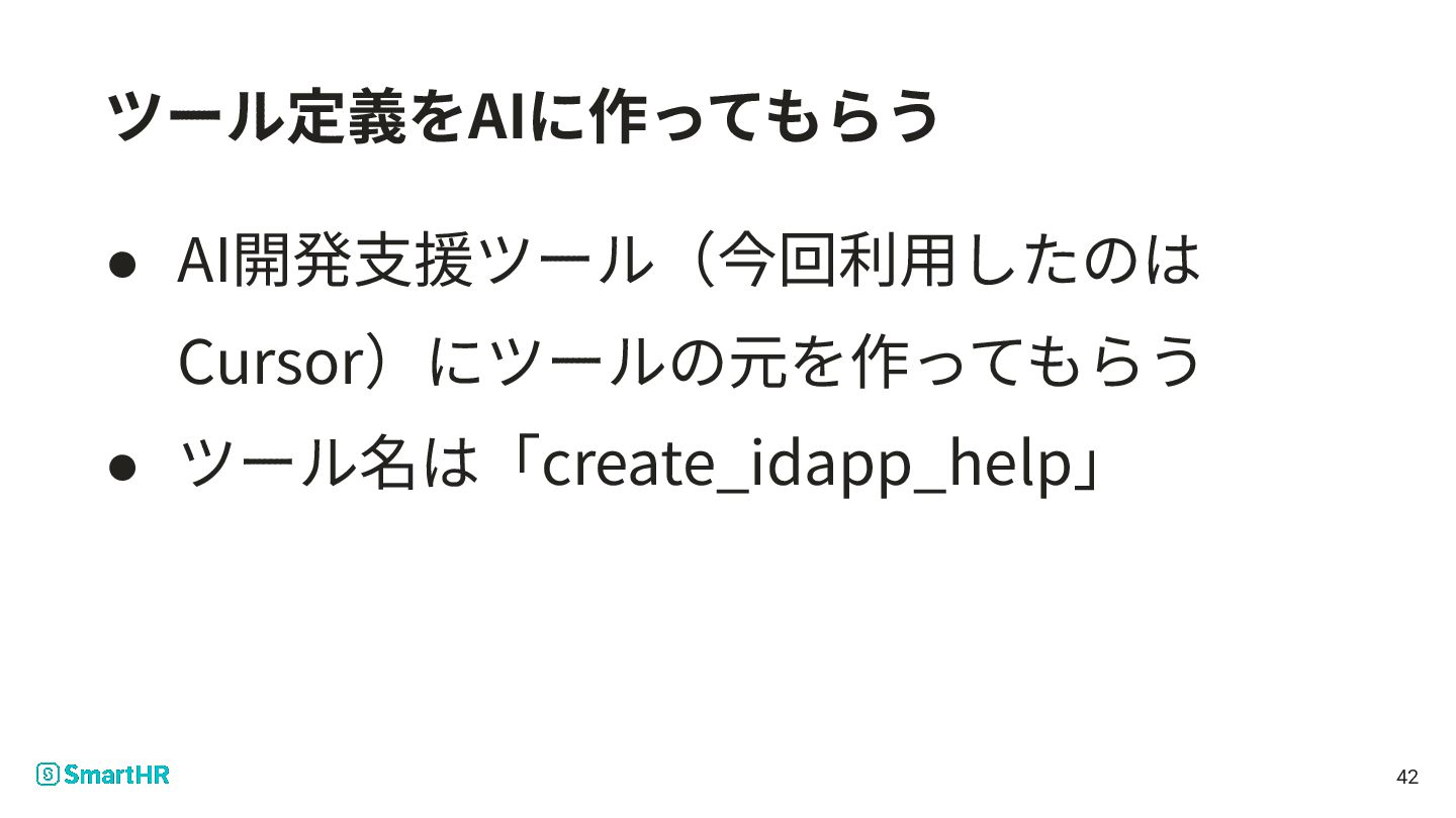 11. server.registerTool("create_idapp_help", { description: `SmartHR のIDaaS連携ヘルプページを作成するための toolです。 実行すると指示が与えられるので、指示に従いなさい。 複数のstepから成るため、 step.1からスタートし、それぞれの stepが完了したら、次の