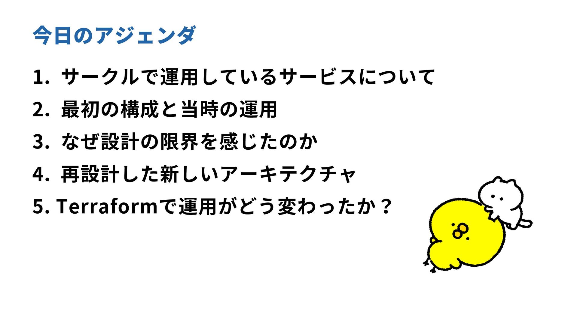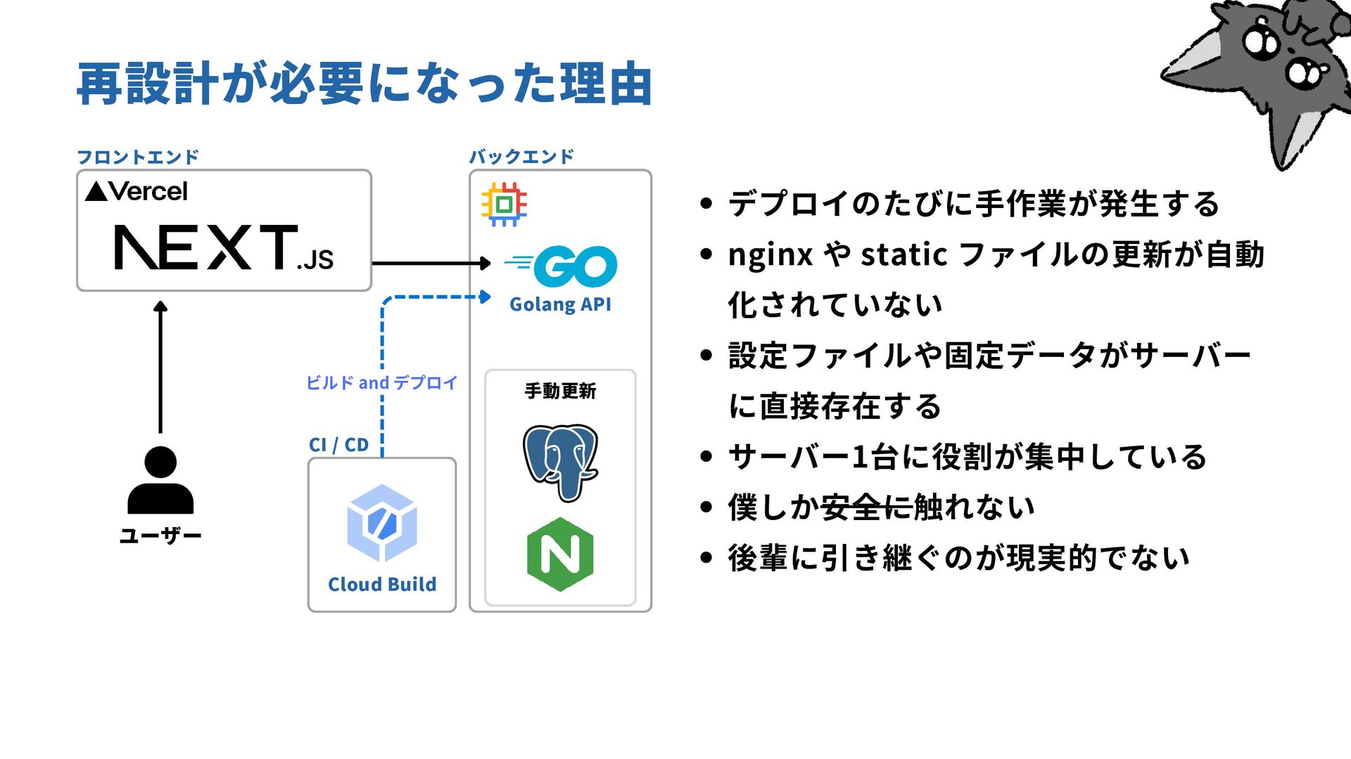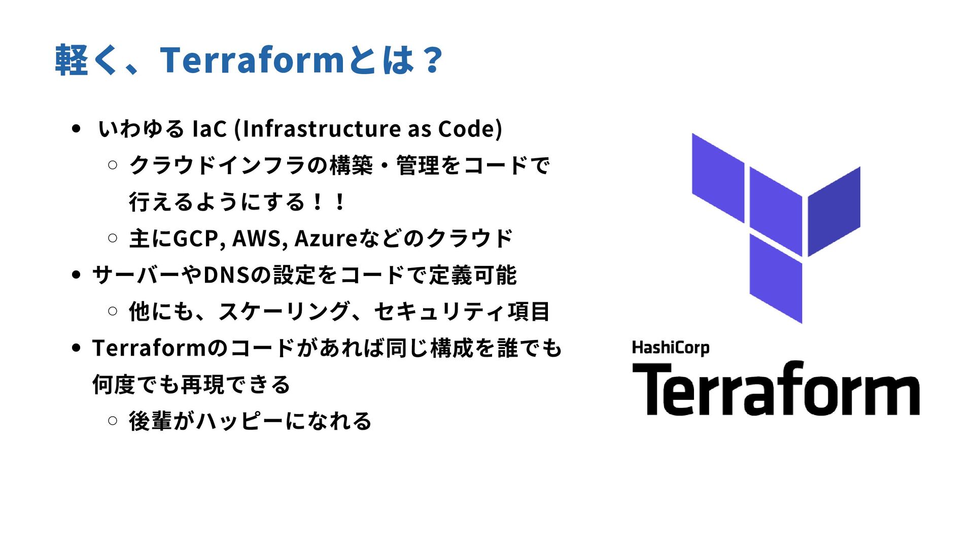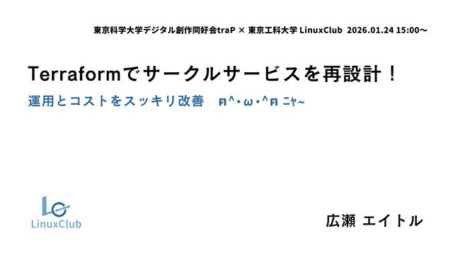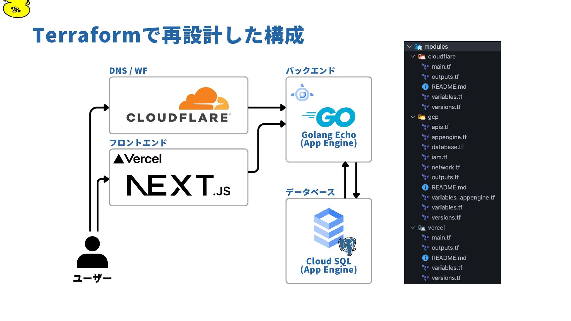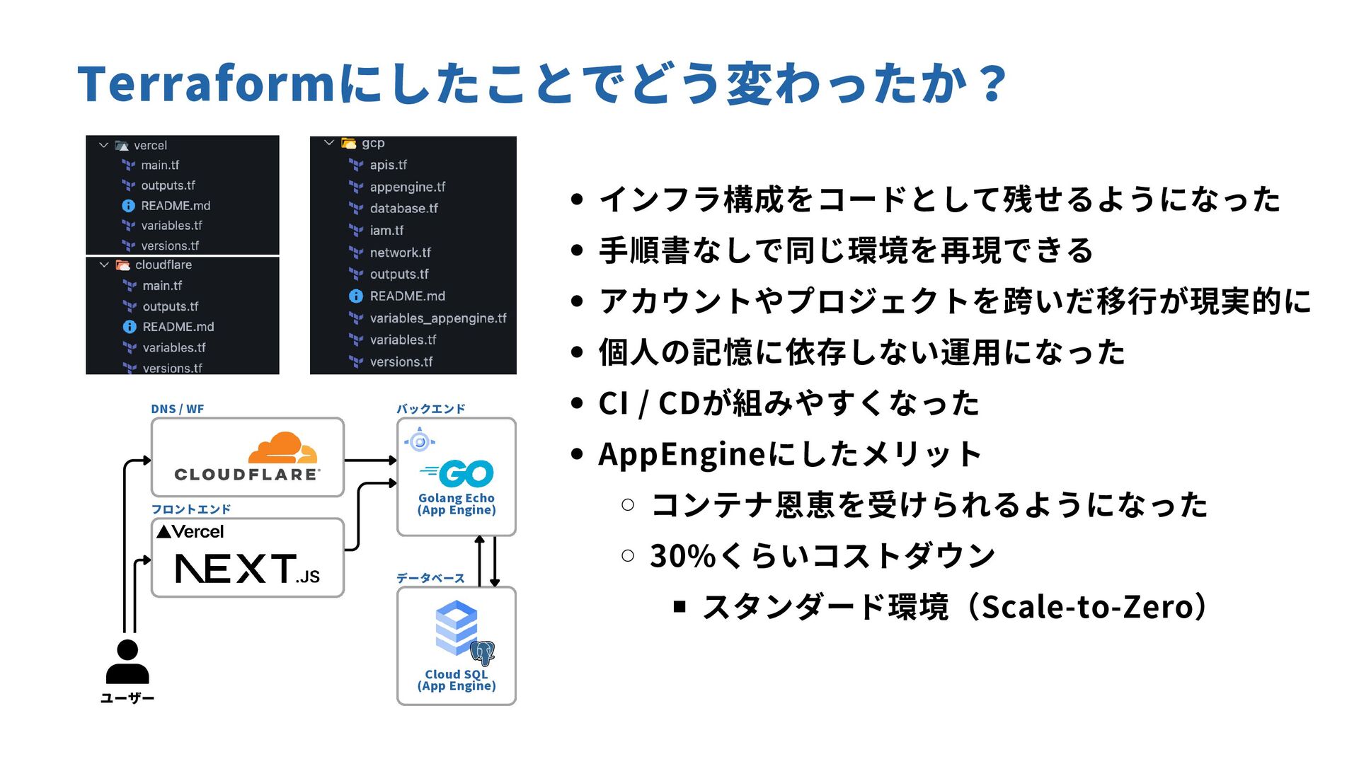 このスライドは、僕がサークルで実際に運用していたサービスを題材に、「このままじゃ回らないな」と感じたところから、Terraformを使って構成を見直した話をまとめたものです。最初は自分しか触れない構成で、デプロイや設定変更のたびに手作業が発生していて、後輩に引き継ぐのも正直かなり厳しい状態でした。そこで、インフラをコードとして管理し、Cloudflare・Vercel・App Engine・Cloud SQLを組み合わせた構成に再設計することで、誰でも同じ環境を再現できて、運用やコスト面も楽になる形を目指しました。
